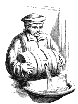 It was not natural to the Roman people ever to forget their great art-works of antiquity; the influence of the “departed spirits” still “ruled them from their urns,” as Byron truthfully expresses it. The artists of Greece and Rome based their compositions on the unvarying truth of nature; and though the barbaric mind might bear sway for awhile, it could not triumph but through ignorance. Rome is now the great art-teacher only because it is the conservator of its ancient relics; and they have had their influence undiminished from the days of Raffaelle and[36] Michael Angelo. There are many pleasing bits of design in the antique city, that show the classic source of inspiration from which their inventors obtained them. The boy and dolphins, forming the pleasing domestic fountain we engrave in Fig. 51, is an evident instance of the influence of antique taste. The abundant supply of water was the grand feature of the Rome of the Cæsars, as it still is of the Rome of the Popes; and the liberality with which every house is served has frequently induced the owners of large mansions to decorate one corner of their external walls with a fountain, at which all wayfarers may be supplied. In a[37] recess of the lowermost story of one of the great palazzi which line the principal street of Rome, “the Corso,” our second specimen (Fig. 52) is placed. It represents a wine-merchant liberally pouring from the bung-hole of his barrel its inexhaustible contents. On great festas in the olden time it was not unusual to make public fountains run with wine for an hour or two, and this may have occurred with the one engraved; it is a work of the latter part of the sixteenth century, when luxury reigned in Rome. As a design it is exceedingly simple and appropriate, reminding, by its quaintness, of German rather than Italian[38] design. The old Teutonic cities present very many striking inventions of the kind: and the promoters and designers of our drinking fountains may obtain good and useful hints from that quarter.