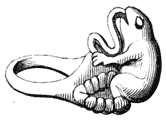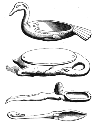 Origin of the term grotesque—Egyptian boxes and spoons—Roman knives and lamps—Mediæval grotesque—Misereres, bosses, and capitals—Domestic utensils—The Ars Memorandi—Decorative plate—The Italian, German, and French goldsmiths—Book illustrations—Grotesque pottery 45-70