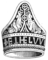 Heraldry, with all its adjuncts, had become so great a passion with the noble, that the invention of the artist and student was taxed for badges and mottoes by noble families. The custom flourished most in Italy, where the impresa of a noble house spoke to the eye at once, whether it was found on a sword-hilt or over a church-door. We give as an instance, in Fig. 3, that adopted by the bold Dukes of Burgundy, sovereigns in their own dominions, and exciting much terror of rivalry in the minds of the kings of France themselves. Their badge, or impresa, was indicative of their rude power; a couple of knotted clubs, saltier-wise, help to support a somewhat conventional figure of the steel used for striking the flint to produce fire; the whole surmounted by the[7] crown, and intended to indicate by analogous reflection the vigour of the ducal house. As a bold defiance, a rival house adopted the rabot, or carpenter’s plane, by which they indicated their determination to smooth by force the formidable knots from the clubs of the proud rulers of Burgundy.