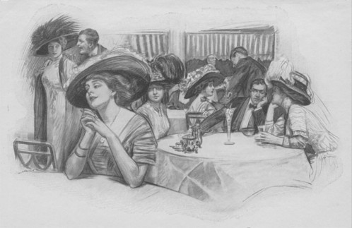 It’s a heliotrope lid, and the foundation must have used up enough straw to bed down a circus. It has the dimensions and general outlines of a summerhouse. The scheme of decoration is simple enough, though. The top of this heliotrope summerhouse has been caught in a heliotrope fog, that’s all. There’s yards and yards of this gauzy stuff draped and puffed and looped around it, with only a wide purple ribbon showin’ here and there and keepin’ the fog in place.