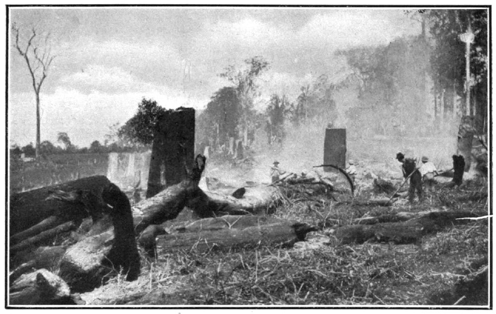 True scrub lands are not by any means the most difficult to clear, though to a "new chum" the work will appear at first of a Herculean character. Brushing the dense undergrowth and then felling the timber at a face costs from £1 10s. to £2 per acre, according to density, size of timber, and proportion of hardwood trees contained in it, and once this is done the fallen mass is allowed to become thoroughly dry, when it is burnt off. A good fire is half the battle, as the subsequent work of burning off the heavy timber left from the first burn is comparatively light. No stumps are taken out, as the bulk are found to rot out in a few years, and their presence in the soil is no detriment to the planting of such crops as bananas or even citrus fruit trees. No special preparation of the land, such as breaking up, &c., is necessary prior to planting. Holes are dug, trees or bananas are planted, and the whole cultivation for the first few years consists in keeping down weed growths with the chipping hoe. Once the stumps have rotted out the plough and other implements of culture take the place of the hoe. These soils are especially adapted for the growth of oranges, limes, mandarins, mangoes, bananas, pineapples, papaws, custard apples, strawberries, and cape gooseberries in the South; in fact, for nearly every kind of tropical and semi-tropical fruit.