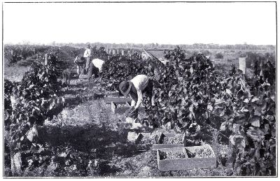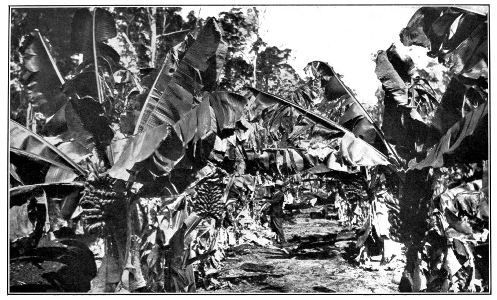 In Queensland, the culture of bananas is confined to the frostless belts of the eastern seaboard, as it is a plant that is extremely susceptible to cold, and is injured by the lightest frosts. It is grown in favourable locations in the South, where it produces excellent fruit, but its cultivation is much greater in the North, where the rainfall is heavier and the average annual temperature greater. In the Southern part of the State its cultivation is entirely in the hands of white growers, who have been growing it on suitable soil in suitable localities for the past fifty years or even more. I recently saw an old plantation that was set out over twenty years ago, and the present plants are still strong and healthy, and bearing good bunches of well-filled fruit, so that there is no question as to the suitability of the soil or climate. Bananas do best on rich scrub land, and it is no detriment to their growth if it is more or less covered with stones as long as there is sufficient soil to set the young plants. Shelter from heavy or cold winds is an advantage, and the plants thrive better under these conditions than when planted in more exposed positions. Bananas are frequently the first crop planted in newly burnt off scrub land, as they do not require any special preparation of such land, and the large amount of ash and partially burnt and decomposed vegetable mould provide an ample supply of food for the plants' use. Bananas are rank feeders, so that this abundance of available plant food causes a rapid growth, fine plants, and correspondingly large bunches of fruit. Though newly burnt off scrub land is the best for this fruit, it can be grown successfully in land that has been under cultivation for many years, provided that the land is rich enough naturally, or its fertility is maintained by judicious green and other manuring. In newly burnt off scrub land all that is necessary is, to dig holes 15 to 18 inches in diameter, and about 2 feet deep, set the young plants in it, and partly fill in the hole with good top soil. The young plant, which consists of a sucker taken from an older plant, will soon take root and grow rapidly under favourable conditions, producing its first bunch in from ten to twelve months after planting. At the same time that it is producing its first bunch it will send up two or more suckers at the base of the parent plant, and these in turn will bear fruit, and so on. After bearing, the stalk that has produced the bunch of fruit is cut down; if this is not done it will die down, as its work has been completed, and other suckers take its place. Too many suckers should not be allowed to grow or the plants will become too crowded, and be consequently stunted and produce small bunches. All the cultivation that is necessary is the keeping down of weed growth, and this, once the plants occupy the whole of the land, is not a hard matter. A plantation is at its best when about three years old, but remains profitable for six years or longer; in fact, there are many plantations still bearing good fruit that have been planted from twelve to twenty years. Small-growing or dwarf kinds, such as the Cavendish variety, are planted at from 12 to 16 feet apart each way, but large-growing bananas, such as the Sugar and Lady's Finger, require from 20 to 25 feet apart each way, as do the stronger-growing varieties of plantain. Plantains are not grown to any extent in Queensland, and our principal varieties are those already mentioned, the Cavendish variety greatly predominating. In the North, the cultivation of this latter variety is carried out on an extensive scale, principally by Chinese gardeners, who send the bulk of their produce to the Southern States of the Commonwealth. The industry supports a large number of persons other than the actual producers of the fruit, and forms one of our principal articles of export from the North. As many as 20,000 or more large bunches of bananas frequently leave by a single steamer for the South, and the bringing of this quantity to the port of shipment gives employment to a number of men on tram lines and small coastal steamers. The shipment of a heavy cargo of bananas presents a very busy scene that is not soon forgotten, the thousands of bunches of fruit that are either piled up on the wharf or that are being unloaded from railway trucks, small steamers or sometimes Chinese junks, forming such a mass of fruit that one often wonders how it is possible to consume it all before it becomes over-ripe. Still, it is consumed, or, at any rate, the greater portion of it is, as it is the universal fruit of the less wealthy portion of the community, the price at which it can be sold being so low that it is within the reach of everyone. A banana garden in full bearing is a very pretty sight, the thousands of plants, each with their one or more bunches of fruit, as, where there are several stems it is not at all uncommon to find two or more bunches of fruit in different states of development on the same plant, forming a mass of vegetation that must be seen to be appreciated. This is the case even with dwarf-growing kinds, but with strong-growing varieties, such as the Lady's Finger, the growth is so excessive that the wonder is, how the soil can support it.