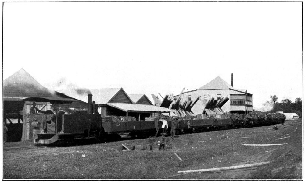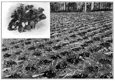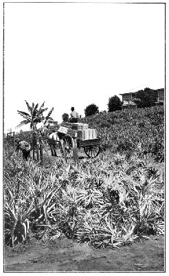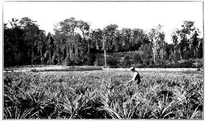 The pineapple comes into bearing early, and, except where suckers throw fruit as soon as planted, bear their first crop in from twelve to twenty months, according to the type of suckers planted and the time of year at which they are set. Practically every sucker will produce a fruit at the first fruiting, and these will be followed by succeeding crops, borne on the successive crops of suckers, so that when the whole of the ground is occupied by plants, the returns are very heavy. One thousand dozen marketable fruits is by no means an unusual crop for Queen pines in a plantation in full bearing, and, taking these at an average of 2½ lb. each, you get a return of 30,000 lb., or 15 tons American per acre. The illustrations herewith give a good general idea of the usual method of growing pines, and the method of handling and marketing, as well as of the nature of the country on which they are grown. The illustrations are mostly of smooth-leaved pines, which bear a fruit averaging from 6 to 8 lb. each, but occasionally running up to as much as 14 to 16 lb., though the latter is an extreme weight. The single pine shown is just under 12 lb. Several kinds of pines are grown, which are generally classified into roughs and smooths. The rough, or rough-leaved pines, such as the Common Queen and Ripley Queen, and local seedlings raised from them, are very prolific, and though not equal in size and appearance to the smooth-leaved Cayenne, our principal smooth-leaved kind, are usually considered to be of superior flavour, and to be better for canning or preserving. Rough pines run up to as much as 6 lb. weight each, but this is uncommon, the best average I have met with being about 4 lb. per pine, and they were exceptionally good. The price at which this fruit sells here seems absurd to those living in cold countries, who are accustomed to look upon it as a luxury only found on the tables of the wealthy, as good rough-leaved pines are worth about 1s. per dozen during the summer season, and smooth-leaved pines from 1s. 6d. to 2s. 6d. a dozen. Prices are certainly higher during the off-season, but growers would be well satisfied to get 1s. per dozen for rough pines all the year round. I have no hesitation in saying that pines can be grown at a profit at from £3 to £4 per ton, so that the cost of growing is so low that there is nothing to prevent us from canning the fruit and selling it at a price that will defy competition.