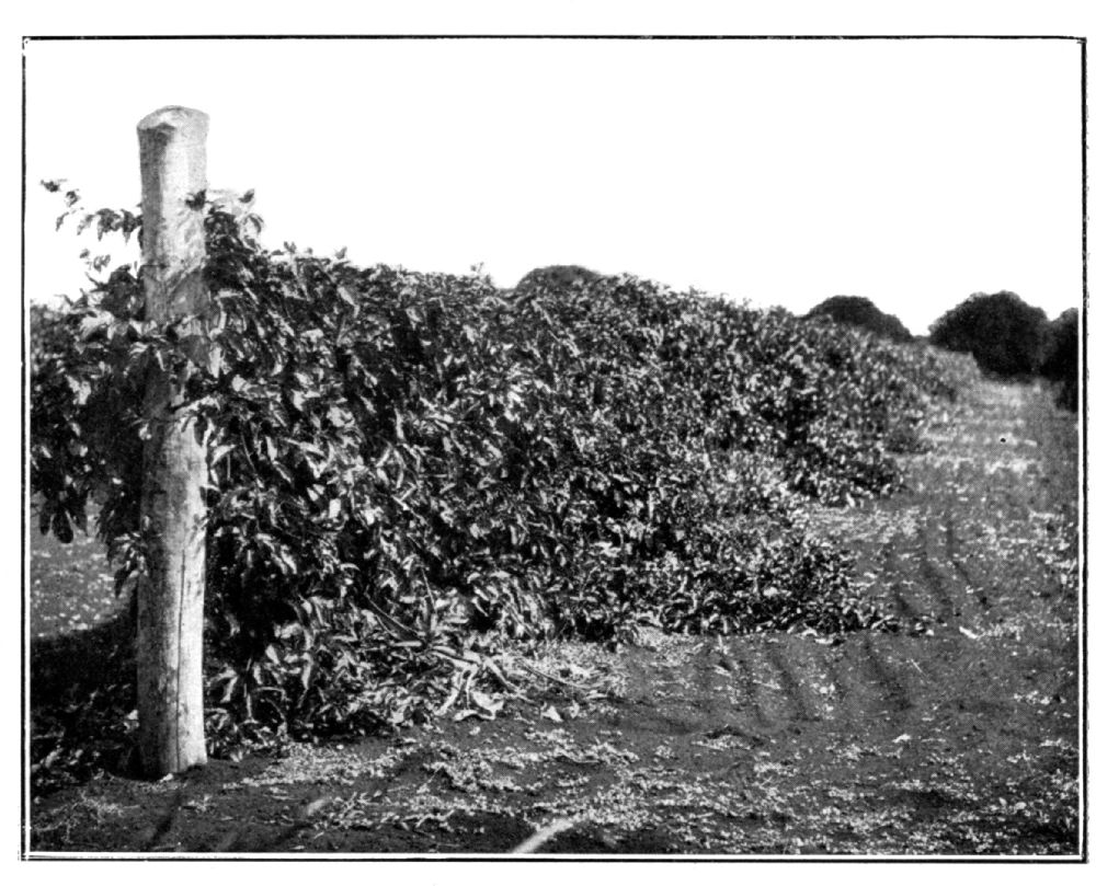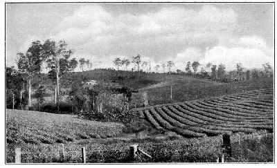 Several distinct types of soil are found that are well adapted for fruit-growing, but they all have one general characteristic which is a sine qua non of success—viz., they must possess good natural drainage, so that there is no danger of their becoming waterlogged or soured during periods of continued or heavy rainfall, as these conditions are fatal to fruit culture under tropical and semi-tropical conditions. Of such soils, the first to be considered are those of basaltic origin. They are usually of a chocolate or rich red colour, are of great depth, in parts more or less covered with basaltic boulders, in others entirely free from stones. The surface soil is friable and easily worked, and the subsoil, which is usually of a rich red colour, is easily penetrated by the roots of trees and plants grown thereon. Occasionally the subsoil is more compact, in which case it is not so good for fruit-tree growth, but is better adapted for that of sugar-cane, corn, grass, &c. These basaltic soils are usually rich, and are covered in their virgin condition with what is termed scrub—a dense mass of vegetation closely resembling an Indian jungle. The scrub growth is totally distinct from forest growth, which will be described later, in that the bulk of the timber growing in it, much of which is of large size, is of a soft nature, and once cut down soon rots away. Imagine a dense wall of vegetation, consisting of large trees running up to 100 or 150 feet in height, with trunks ranging from 2 to 8 feet, or even more, in diameter, and between these trunks an impenetrable mass of smaller growths, all of the most vivid green colours, together with innumerable vines and creepers that are suspended from the branches of the trees, hanging in festoons, creeping palms and bamboos, ferns and orchids of many kinds, both on the ground and growing on the tree trunks, as well as many beautiful foliage plants only found in hothouses in England, and you will have a faint idea of what a virgin scrub in coastal Queensland is like. Much of the timber of the coastal scrubs is of considerable commercial value for building purposes and furniture making, and is, or should be, so utilised prior to felling and burning off.