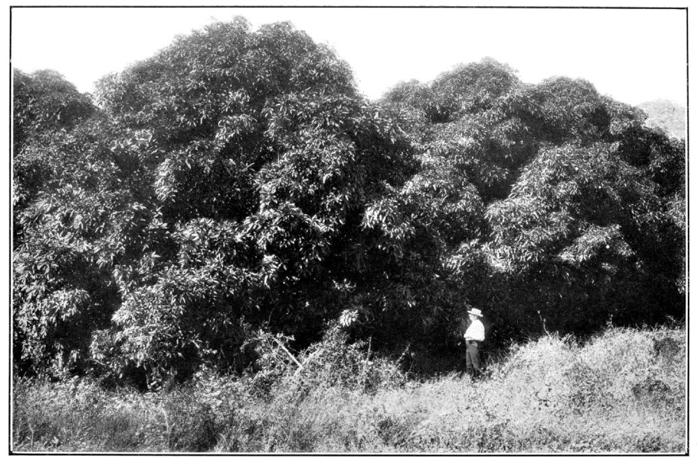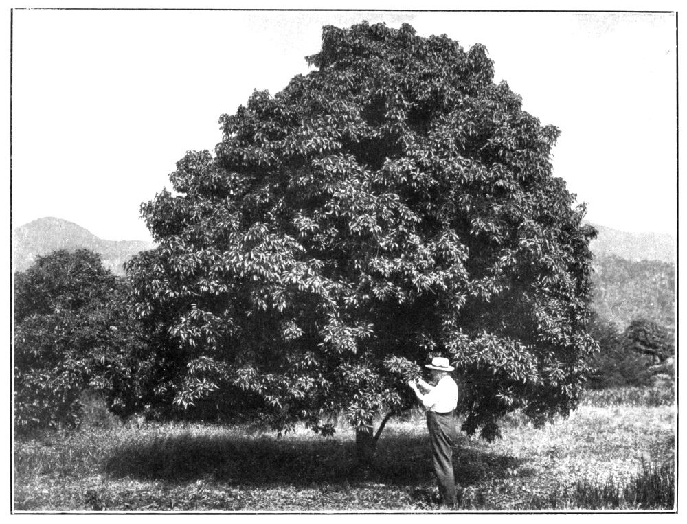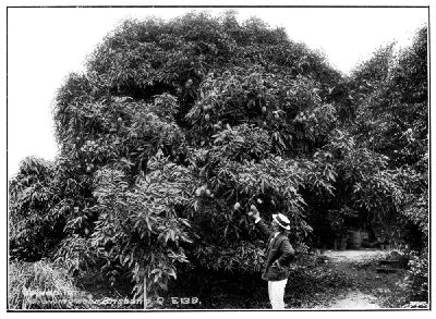 The mango grows to a large size here, even when comparatively young. I know trees over 50 feet in height, having a spread of the branches of more than 60 feet, a main trunk nearly 3 feet in diameter, that are under thirty years old, and that have borne from 1 to 2 tons of fruit for a single crop. Hundreds of tons of fruit go to waste annually for want of a market, or are consumed by farm animals, as the consumption of the fruit is practically confined to this State, and the production is greater than we can consume, despite the fact that mangoes are in season from the end of September to March, and that they are a favourite fruit with all who have acquired a liking for them. In addition to the consumption of the fruit in its fresh state, a quantity is converted into chutney, but this is so small that it has no appreciable effect on the crop as a whole. The unripe fruit makes an excellent substitute for apples, and is used stewed or for pies or tarts, and when sliced and dried it may be stored and used in a similar manner to dried apples.