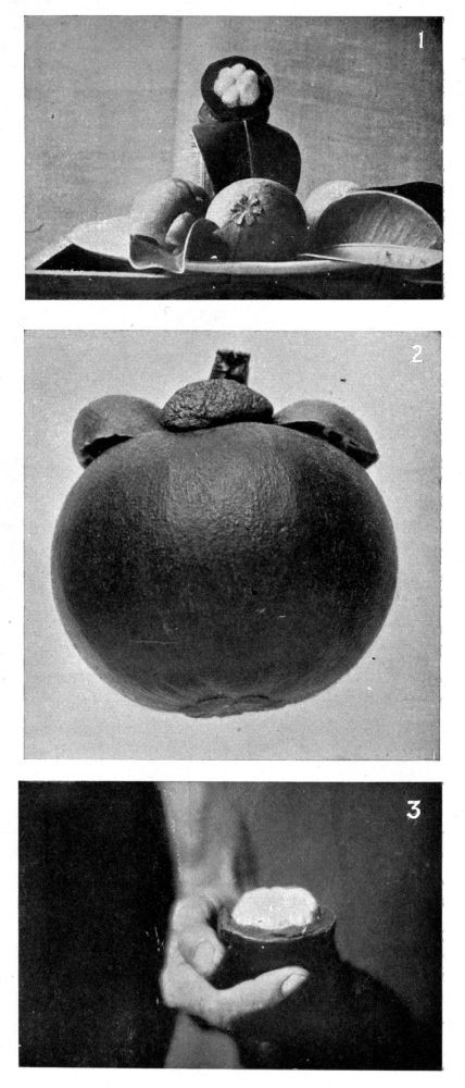 Many attempts have been made during past years to introduce this delicious fruit into Queensland, but these always resulted in failure. True, a certain variety of mangosteen has been successfully grown at Port Douglas, also on the Lower Burdekin, and rumours of the existence of the true Java mangosteen (Garcinia mangostana) have been received, but, in nearly every case, they have, on investigation, proved to be Garcinia xanthochymus, or some other species. At the Kamerunga State Nursery, however, trees of undoubted parentage were successfully raised. It is said that a thriving young plant, which is unquestionably G. mangostana, is owned by Mr. Banfield, of Dunk Island. The records of the Kamerunga Nursery show that in October, 1891, a quantity—about 100—of ripe mangosteen fruit was received from the Batavian agency by the then manager, Mr. Ebenezer Cowley, from which some 600 seeds were obtained. Of these, only a few germinated. The next mention is of the distribution, in February, 1892, of six plants to an applicant on the Mossman, and of two more in May of that year. Since then several young trees have been raised at the nursery, and one of them, in January, 1913, fruited for the first time for twenty-two years, and is the first to have done so in this State. Some of the fruit was sent to the Department of Agriculture and Stock, and proved to be fully equal to those of Java. A full history of the mangosteen and of its introduction into Queensland is given in "The Queensland Agricultural Journal" (vol. xxx., June and July, 1913). The photographs were taken from the original fruit.