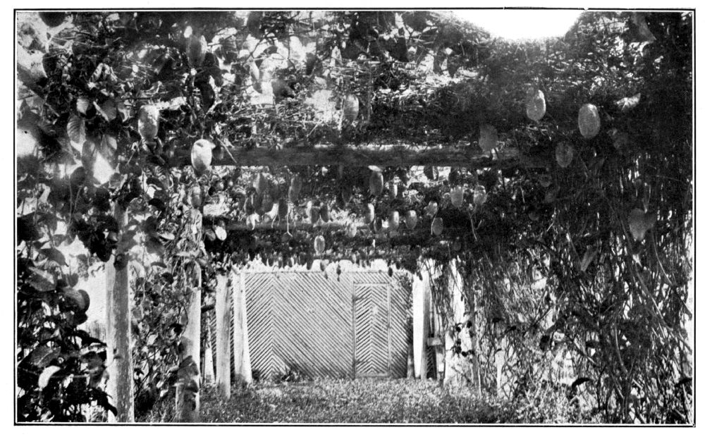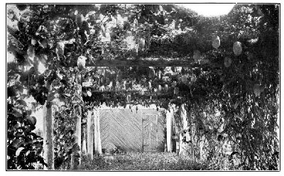 A vine, belonging to the natural order Passifloreæ, that produces one of our most delicious tropical fruits. The papaw and the passion fruit belong to this same order. It can be grown all along our eastern seaboard, but comes to greatest perfection in the North. The fruit is of a pale greenish-yellow colour, cylindrical in shape, and varies in weight from about 1 to 5 lb., the largest fruits being produced on a sub-species. The fruit consists of an outer pulpy covering, which can be used for cooking if desired, which surrounds a cavity filled with seeds which are encased in a jelly-like mass. This is the portion eaten, and to use an Americanism, "It is not at all hard to take." It is either eaten by itself, or is used in conjunction with papaw and other fruits to make a fruit salad, a dish that is fit for the food of the gods, and once taken is never forgotten.
