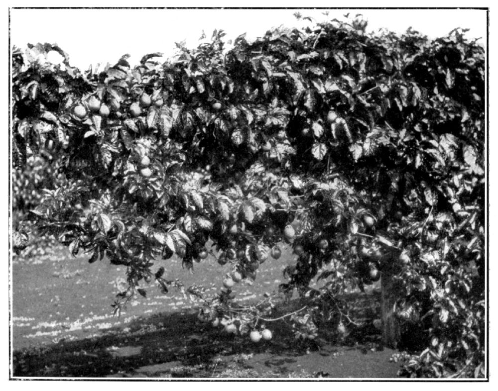 This fruit is very closely related to the granadilla, but is much hardier than it, and can be grown to perfection much further South. It is not injured by frost to any extent in any part of coastal Queensland, and can be grown a considerable distance inland. It is more rightly a semi-tropical than a tropical fruit, though, as it is so nearly related to the granadilla, I have included it amongst the tropical fruits. It is also a vine, and, when grown commercially, is trained along a horizontal trellis, in a somewhat similar manner to a grape vine. It is readily grown from seed, and will produce fruit in less than twelve months from the time that it is planted, and will continue to bear fruit for some years. It does best on a free, warm soil of fair quality, though it may be grown anywhere with care, and often thrives well in very poor soils with the addition of manure. It is found growing wild on the borders of many of our scrubs and elsewhere, the seeds having been deposited by birds or other agencies, and under such conditions it produces an abundance of fruit. The fruit is of a roundish oval shape, and is of a dark-purple colour. It is about the size of a large hen's egg, the outer skin being hard and shell-like, and the centre filled with the seeds, which are surrounded with a jelly-like mass and a yellowish pulp. It is a very fine flavoured fruit, and is universally liked. It is grown in considerable quantities in the Southern part of the State, and is one of our commonest fruits. It has usually two crops a year—a summer and a winter crop—but can be got to produce its fruit at any particular time that is desired by systematic pruning at different times of the year. It is often grown over sheds, dead trees, fallen logs, &c., which it covers with a mass of dense green foliage, and converts what would otherwise be an unsightly object into an ornament. The illustration herewith shows this well, and gives a good idea of the growth of a single vine. Commercially it is grown on trellis, so that the land between the rows can be kept well cultivated, and also to permit of ease in the gathering of the fruit. When ripe, the fruit drops, and the gathering is usually from the ground. The fruit carries well, but will not keep for any length of time, as it shrivels up. It is principally used as a fresh fruit, though it is also made into jam or jelly, and it often forms part of a fruit salad, taking the place of the granadilla. It has few pests, and is one of the easiest fruits to grow.