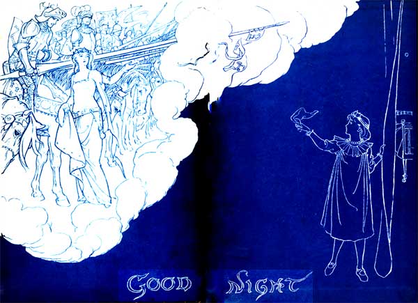 But Arthur had many battles to fight and many Kings to conquer before he was acknowledged lord of them all, and often he would have failed had he not listened to the wisdom of Merlin, and been helped by his sword Excalibur, which in obedience to Merlin's orders he never drew till things were going ill with him. Later it shall be told how the King got the sword Excalibur, which shone so bright in his enemies' eyes that they fell back, dazzled by the brightness. Many Knights came to his standard, and among them Sir Ban, King of Gaul beyond the sea, who was ever his faithful friend. And it was in one of these wars, when King Arthur and King Ban and King Bors went to the rescue of the King of Cameliard, that Arthur saw Guenevere, the King's daughter, whom he afterwards wedded. By and by King Ban and King Bors returned to their own country across the sea, and the King went to Carlion, a town on the river Usk, where a strange dream came to him.