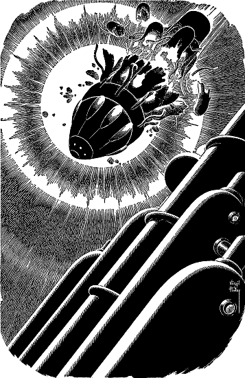 "Aye, sir," I replied, slipping into the chair and fastening the web. I slipped the helmet on my head and instantly I was a part of the ship. It's a strange feeling, this synthesis of man and metal that makes a fighting ship the metallic extension of the Commander's will. I was conscious of every man on duty. What they saw I saw, what they heard I heard, through the magic of modern electronics. The only thing missing was that I couldn't feel what they felt, which perhaps was a mercy considering the condition of the crew. Using the sensor circuits in the command helmet, I let my perception roam through the ship, checking the engines, the gun crews, the navigation board, the galley—all the manifold stations of a fighting ship. Everything was secure, the ship was clean and trimmed, the generators were producing their megawatts of power without a hitch, and the converters were humming contentedly, keeping us in the blue as our speed built to fantastic levels.