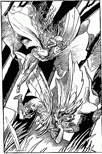 The works of Richard Doyle (1824-1883) enjoy in a lesser degree the sort of inflated popularity which has gathered around those of Cruikshank. With much spirit and pleasant invention, Doyle lacked academic skill, and often betrays considerable weakness, not merely in composition, but in invention. Yet the qualities which won him reputation are by no means despicable. He evidently felt the charm of fairyland, and peopled it with droll little folk who are neither too human nor too unreal to be attractive. He joined the staff of Punch when but nineteen, and soon, by his political cartoons, and his famous "Manners and Customs of y^e English drawn from y^e Quick," became an established favourite. His design for the cover of Punch is one of his happiest inventions. So highly has he been esteemed that the National Gallery possesses one of his pictures, The Triumphant Entry; a Fairy Pageant. Children's books with his illustrations are numerous; perhaps the most important are "The Enchanted Crow" (1871), "Feast of Dwarfs" (1871), "Fortune's Favourite" (1871), "The Fairy Ring" (1845), "In Fairyland" (1870), "Merry Pictures" (1857), "Princess Nobody" (1884), "Mark Lemon's Fairy Tales" (1868), "A Juvenile Calendar" (1855), "Fairy Tales from all Nations" (1849), "Snow White and Rosy Red" (1871), Ruskin's "The King of the Golden River" (1884), Hughes's "Scouring of the White Horse" (1859), "Jack the Giant Killer" (1888), "Home for the Holidays" (1887), "The Whyte Fairy Book" (1893). The three last are, of course, posthumous publications.
