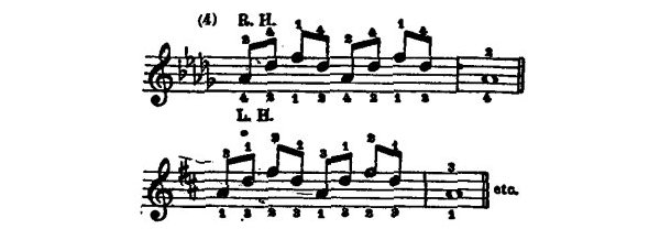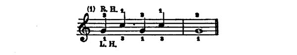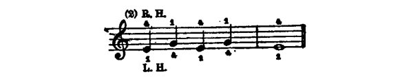 "I ofttimes find it expedient to adapt a more difficult fingering of some given passage for the reason that the difficult fingering frequently leads to a better interpretation of the composer's meaning. I know of innumerable passages in the piano classics which illustrate this point. Moreover a fingering that seems difficult at first is often more simple than the conventional or arbitrary fingering employed[276] by the student, after the student has given sufficient time to the new fingering. The required accent often obliges the performer to employ a different fingering. The stronger fingers are naturally better adapted to the stronger accents. Otherwise it is best to use a similar fingering for similar passages.