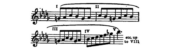 To the sincere student every piece presents technical problems peculiar to itself. The main objection to all technical study is that unless the pupil is vitally interested the work becomes monotonous. The student should constantly strive to avoid monotony in practicing exercises. As soon as the exercises become dull and uninteresting their value im[257]mediately depreciates. The only way to avoid this is to seek variety. As I have said in my Methodik des Klavierspiels: "The musical and tonal monotony of technical exercises may be lessened in a measure by progressive modulations, by various rhythmical alterations, and further through frequent changes in contrary motion." Great stress should be laid upon practice in contrary motion. The reason for this is obvious to all students of harmony. When playing in contrary motion all unevenness, all breaks in precision and all unbalanced conditions of touch become much more evident to the ear than if the same exercises were played in parallel motion. Another important reason for the helpfulness of playing in contrary motion is not to be undervalued. It is that a kind of physical 'sympathy' is developed between the fingers and the nerves which operate them in the corresponding hands. For instance, it is much easier to play with the fifth finger of one hand and the fifth finger of the other hand than it is to play with the third finger of one hand and the fifth finger of another."
