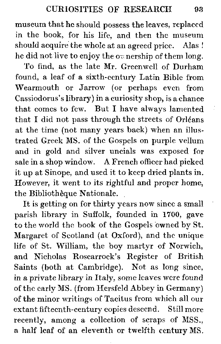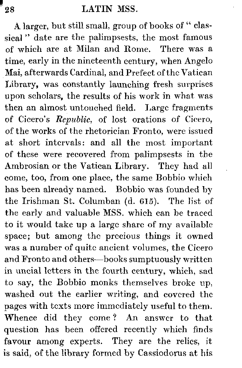 A larger, but still small, group of books of "classical" date are the palimpsests, the most famous of which are at Milan and Rome. There was a time, early in the nineteenth century, when Angelo Mai, afterwards Cardinal, and Prefect of the Vatican Library, was constantly launching fresh surprises upon scholars, the results of his work in what was then an almost untouched field. Large fragments of Cicero's Republic, of lost orations of Cicero, of the works of the rhetorician Fronto, were issued at short intervals: and all the most important of these were recovered from palimpsests in the Ambrosian or the Vatican Library. They had all come, too, from one place, the same Bobbio which has been already named. Bobbio was founded by the Irishman St. Columban (d. 615). The list of the early and valuable MSS. which can be traced to it would take up a large share of my available space; but among the precious things it owned was a number of quite ancient volumes, the Cicero and Fronto and others—books sumptuously written in uncial letters in the fourth century, which, sad to say, the Bobbio monks themselves broke up, washed out the earlier writing, and covered the pages with texts more immediately useful to them. Whence did they come? An answer to that question has been offered recently which finds favour among experts. They are the relics, it is said, of the library formed by Cassiodorus at his[29] monastery of Vivarium or Squillace, in South Italy. Cassiodorus is a great figure in the history of his own time, and in his influence upon the general course of learning. He was private secretary to Theodoric King of the Goths; in his old age he retired from public to monastic life, and his last years were devoted to equipping the monks he had gathered about him for study—first and foremost the study of the Scriptures, but also, as leading up to that, the study of languages, of history and geography, and, as conducing to the general welfare, of medicine, botany, and other useful arts. It had been a cherished project of his to found an academy at Rome where all such learning might be fostered, but that plan failed, and Cassiodorus took into his retreat at Vivarium all the store of books he had accumulated, and wrote a little manual to guide his monks to the right use of them. His Institutes (as the book is called) do not give a set catalogue of his library, but there are many and striking coincidences between the manual and the literary works which can be traced to Bobbio. A specimen may be given: he recommends a writer on gardening called Gargilius Martialis. Hardly anyone else mentions this person, and his work had disappeared until Mai found pieces of it in a palimpsest at Naples which had come from Bobbio. We owe much to Cassiodorus in any case, for it was he who commended secular learning to monks,[30] and the fact that monks were the great preservers of ancient literature cannot be dissociated from his influence. I shall be glad if the theory I have stated (it is that of the late Dr. Rudolf Beer) proves sound; to have some of the very volumes which Cassiodorus handled would be worth much.