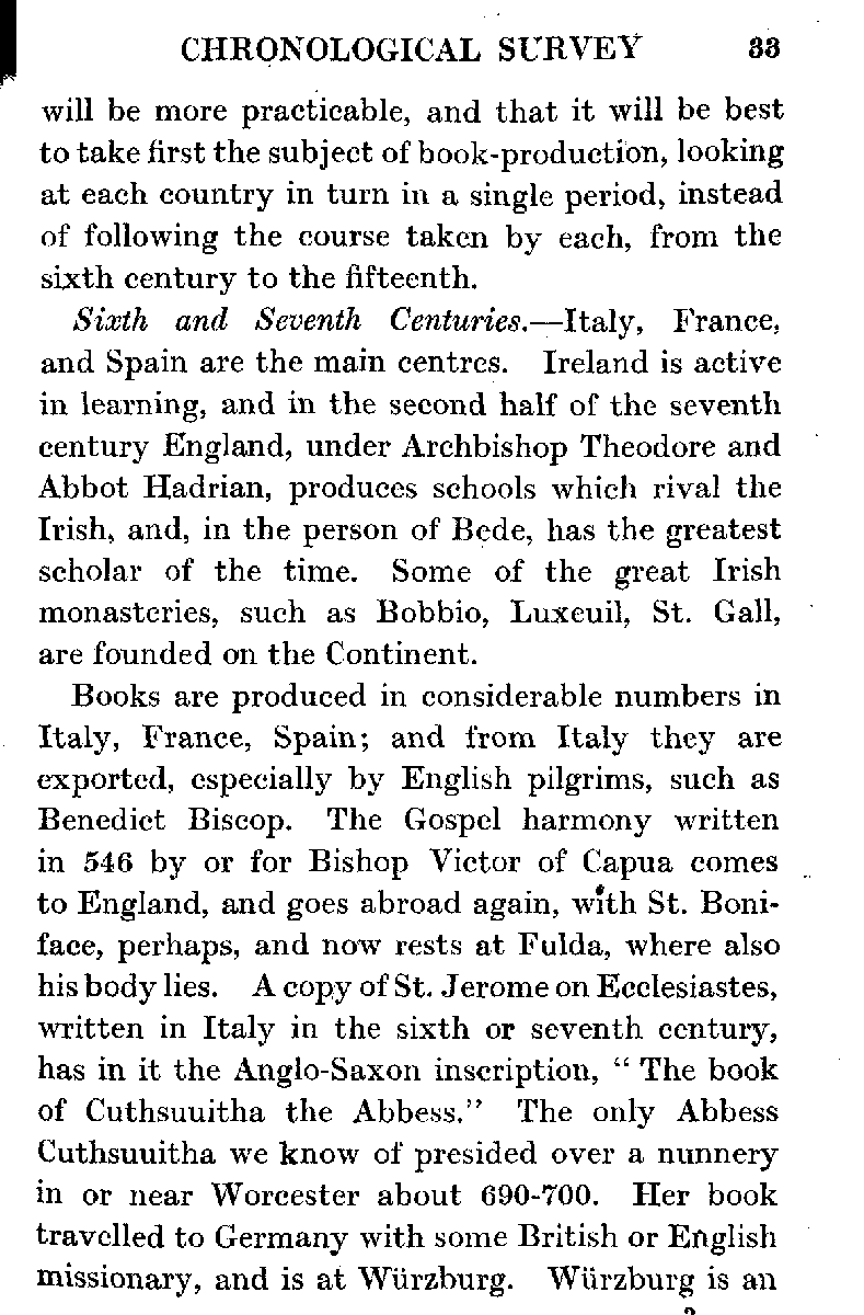 Books are produced in considerable numbers in Italy, France, Spain; and from Italy they are exported, especially by English pilgrims, such as Benedict Biscop. The Gospel harmony written in 546 by or for Bishop Victor of Capua comes to England, and goes abroad again, with St. Boniface, perhaps, and now rests at Fulda, where also his body lies. A copy of St. Jerome on Ecclesiastes, written in Italy in the sixth or seventh century, has in it the Anglo-Saxon inscription, "The book of Cuthsuuitha the Abbess." The only Abbess Cuthsuuitha we know of presided over a nunnery in or near Worcester about 690-700. Her book travelled to Germany with some British or English missionary, and is at Würzburg. Würzburg is an[34] Irish foundation; its apostle and patron, St. Kilian, is said to have been assassinated in 689. From Italy, too, came (most likely) the illustrated Gospels now at Corpus Christi College, Cambridge (286), which belonged once to Christchurch, Canterbury; and the beautiful little copy of St. John's Gospel at Stonyhurst College, which was found in the coffin of St. Cuthbert (d. 687) when it was opened in 1104. And St. Gall must have acquired its ancient Virgil from Italy also—when, we do not know.