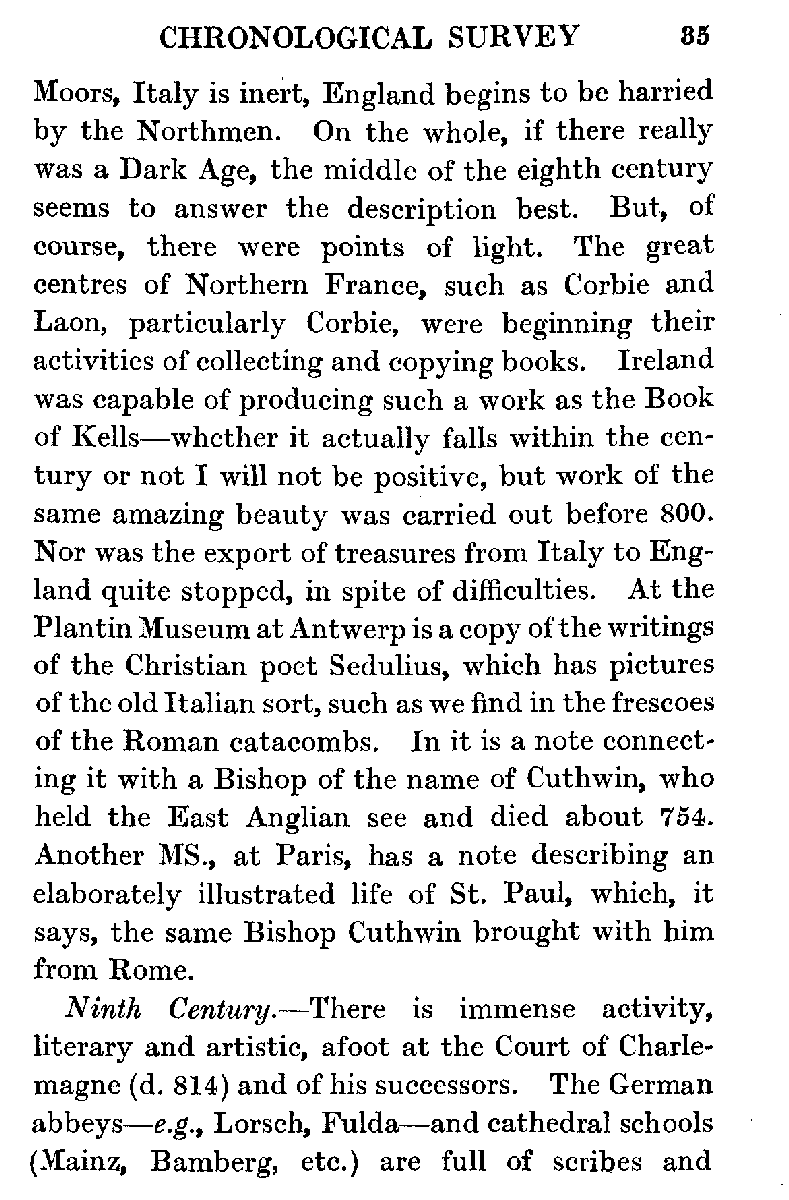 Eighth Century.—This sees the last part of Bede's career (d. 734)—the zenith of English scholarship, the mission of St. Boniface (d. 758) to Germany, the meeting of Alcuin with Charlemagne (781), and the beginning of the Carolingian Renaissance. But, on the other hand, Spain is overrun by the[35] Moors, Italy is inert, England begins to be harried by the Northmen. On the whole, if there really was a Dark Age, the middle of the eighth century seems to answer the description best. But, of course, there were points of light. The great centres of Northern France, such as Corbie and Laon, particularly Corbie, were beginning their activities of collecting and copying books. Ireland was capable of producing such a work as the Book of Kells—whether it actually falls within the century or not I will not be positive, but work of the same amazing beauty was carried out before 800. Nor was the export of treasures from Italy to England quite stopped, in spite of difficulties. At the Plantin Museum at Antwerp is a copy of the writings of the Christian poet Sedulius, which has pictures of the old Italian sort, such as we find in the frescoes of the Roman catacombs. In it is a note connecting it with a Bishop of the name of Cuthwin, who held the East Anglian see and died about 754. Another MS., at Paris, has a note describing an elaborately illustrated life of St. Paul, which, it says, the same Bishop Cuthwin brought with him from Rome.