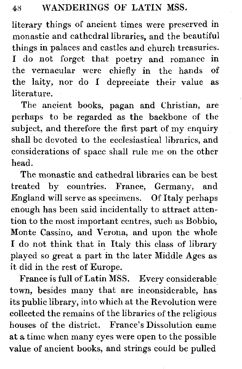 The monastic and cathedral libraries can be best treated by countries. France, Germany, and England will serve as specimens. Of Italy perhaps enough has been said incidentally to attract attention to the most important centres, such as Bobbio, Monte Cassino, and Verona, and upon the whole I do not think that in Italy this class of library played so great a part in the later Middle Ages as it did in the rest of Europe.