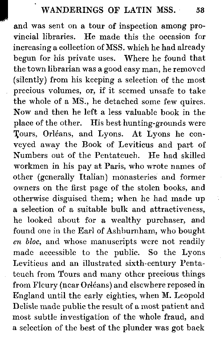 France is full of Latin MSS. Every considerable town, besides many that are inconsiderable, has its public library, into which at the Revolution were collected the remains of the libraries of the religious houses of the district. France's Dissolution came at a time when many eyes were open to the possible value of ancient books, and strings could be pulled[49] and influence exercised to stem the unreasoning fury that said: