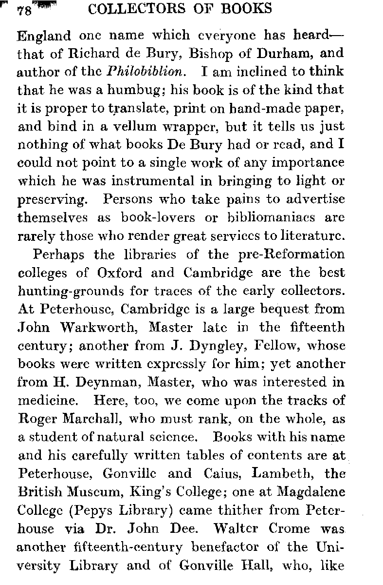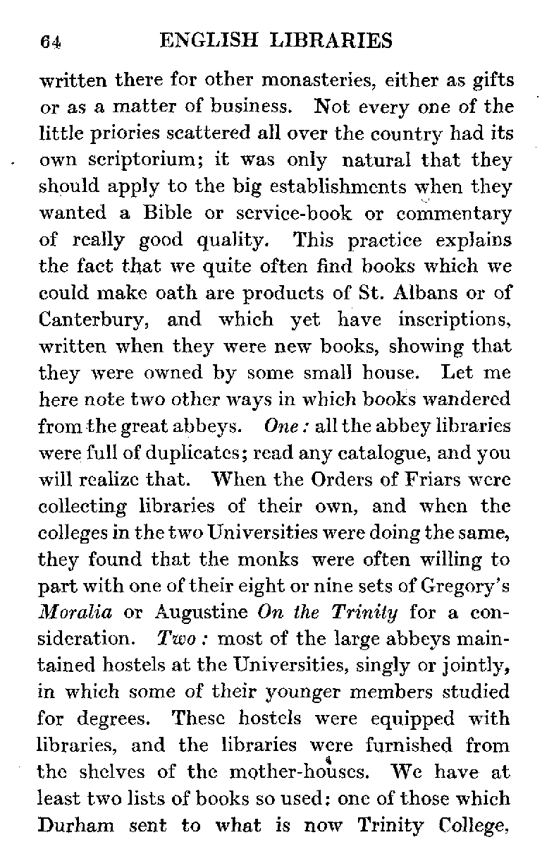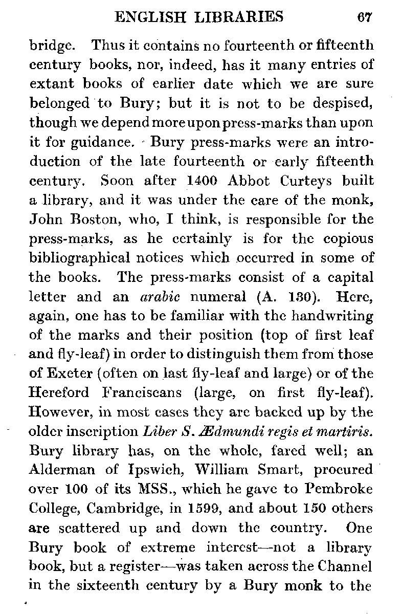 Whether or not a breath of influence from Italy was the cause, it is plain that library-making was popular in countries and circles which were not obviously affected by the Renaissance. The monasteries of England were certainly not so affected, yet we find many of them setting their books in order and building special rooms to contain them. Christchurch at Canterbury and Bury St. Edmunds are leading instances. Now, too, Universities and colleges made fresh catalogues, and received large accessions of books.