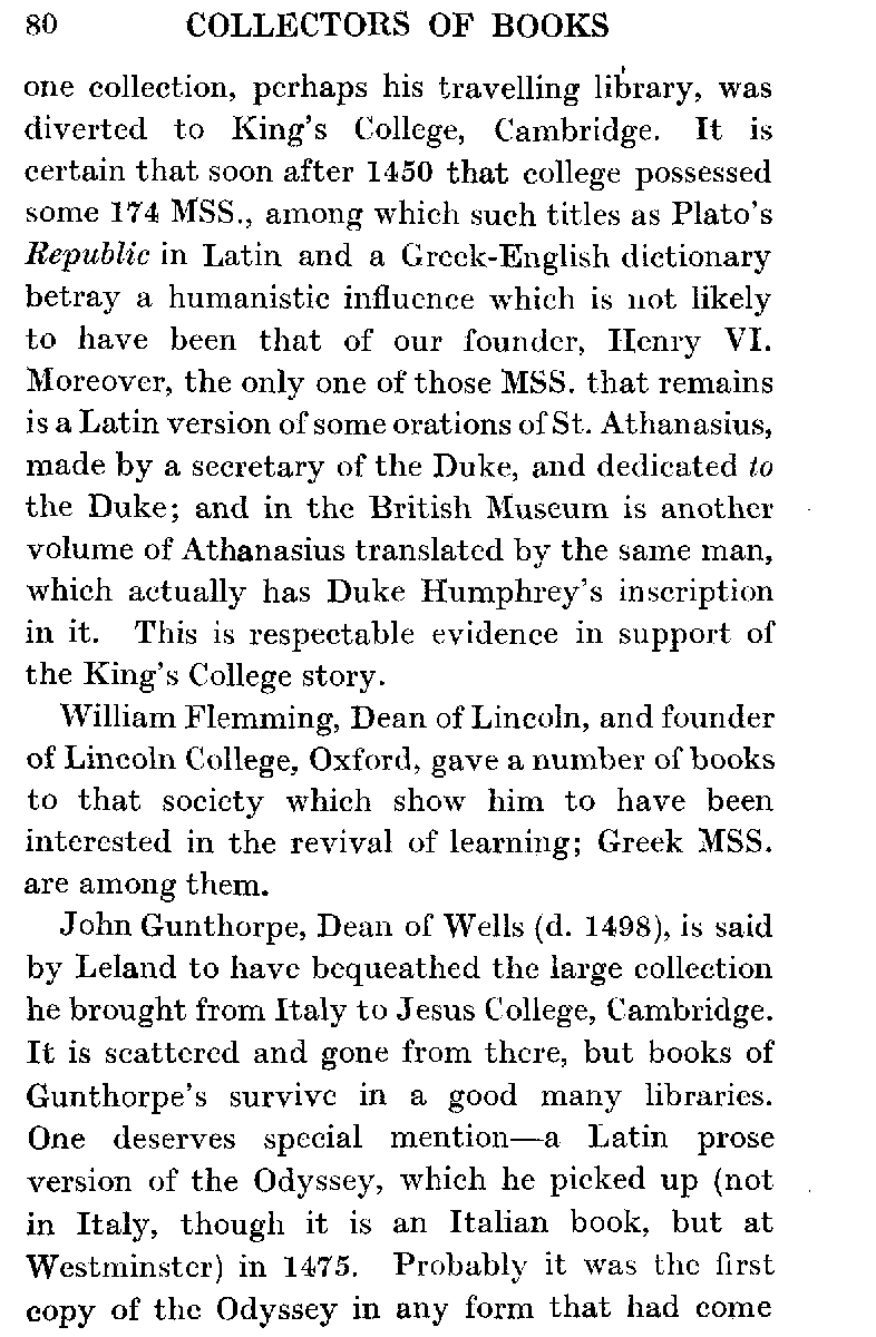 If the Renaissance did not touch the English public as a whole in this century, it made some[46] proselytes. Among Englishmen who dealt with our Florentine Vespasiano were John Tiptoft, Earl of Worcester, Humphrey, Duke of Gloucester, William Gray, Bishop of Ely, Andrew Holes, of Wells. Others who resorted to Italy were John Free, Thomas Linacre, John Gunthorpe, Dean of Wells, William Flemming, Dean of Lincoln, William Tilley of Sellinge, Prior of Christchurch, Canterbury. We shall see later on what traces some of these have left on our libraries.