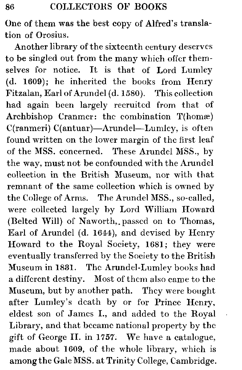 The first shelf I lay hands upon contains some ten large folios. Four of them are a single great compilation, beginning with a survey of the history of the world and of the Roman Empire, and merging into the heraldry of the German noblesse. It was made, we find, in 1541, and is dedicated to Henry VIII. Large folding pictures on vellum and portraits of all the Roman Emperors adorn the first volume. It is a sumptuous book, supposed to be a present from the Emperor Ferdinand to the King. How did it come here? A printed label tells us that it was given to the college by Henry Temple, Viscount Palmerston, in 1750 (he had previously given it to Sir Richard Ellys on whose death Lady Ellys returned it: so much in parenthesis). Then, more by luck than anything else, I find mention of it in the diary of Thomas Hearne, the Oxford antiquary; his friend Thomas Jett, F.R.S., owned it and told him about it in 1722: he had been offered £100 a volume for it; it was his by purchase from one Mr. Stebbing. It was sold, perhaps to Palmerston, at Jett's auction in 1731. The gap between Henry VIII. and Stebbing remains for the present unfilled. So much for the first draw.