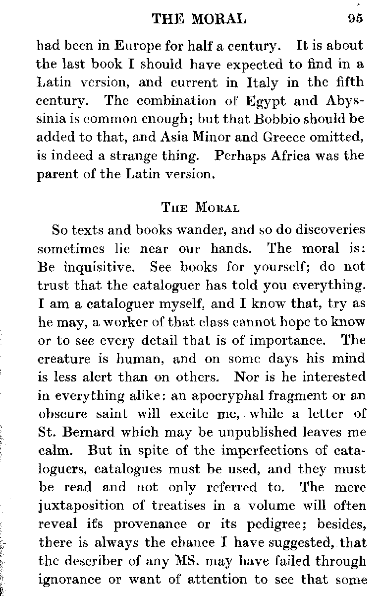 The ancient books, pagan and Christian, are perhaps to be regarded as the backbone of the subject, and therefore the first part of my enquiry shall be devoted to the ecclesiastical libraries, and considerations of space shall rule me on the other head.