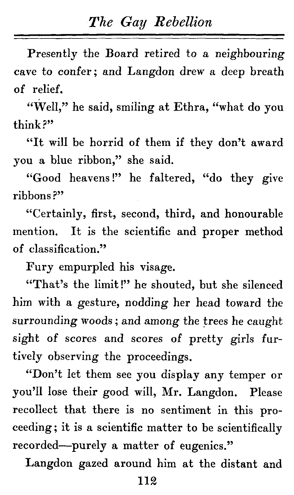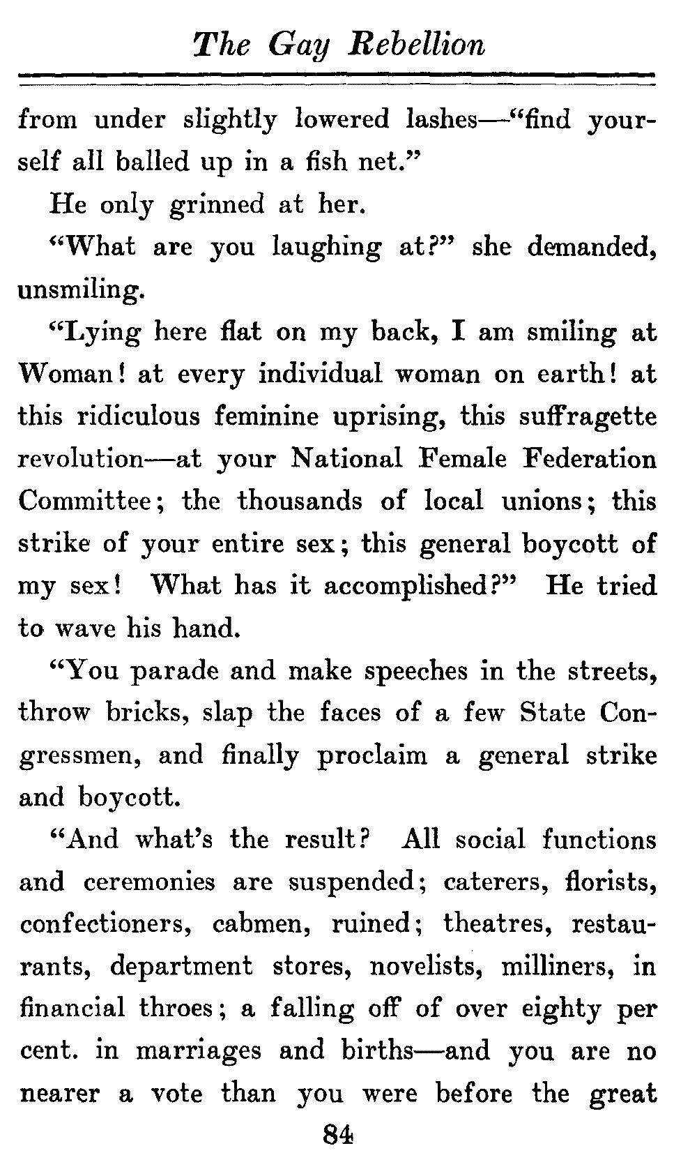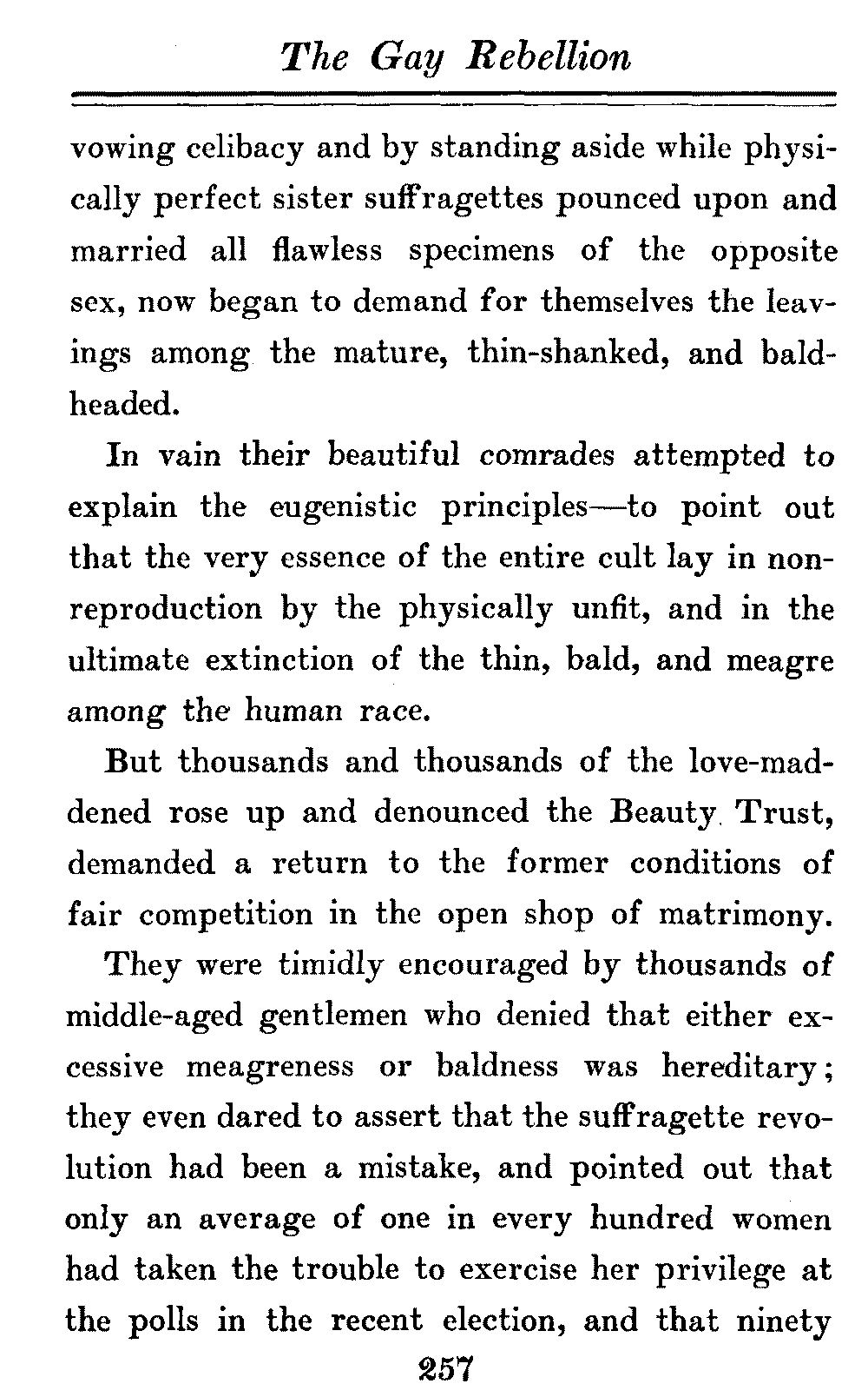 Even Augustus Melnor, owner and editor of that greatest of New York daily newspapers, the Morning Star, continued to pay overwhelming attention to his personal appearance, confident that the great feminine revolt was on its last shapely legs, and that once more womankind would be kind to any kind of mankind, and flirt and frivol and marry, and provide progeny, and rock the cradle as in the good old days of yore.