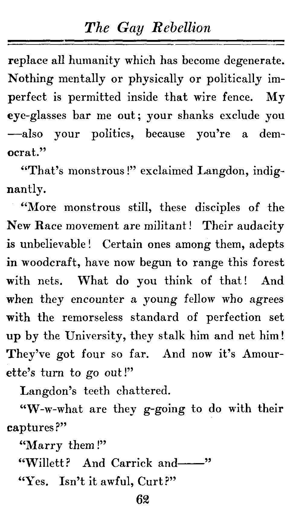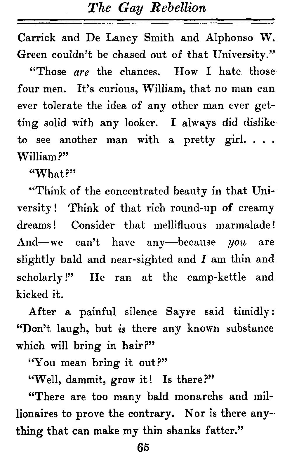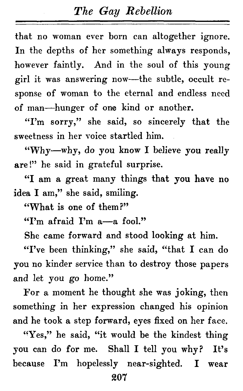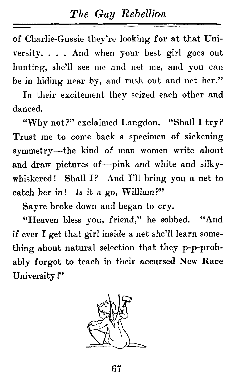Even Augustus Melnor, owner and editor of that greatest of New York daily newspapers, the Morning Star, continued to pay overwhelming attention to his personal appearance, confident that the great feminine revolt was on its last shapely legs, and that once more womankind would be kind to any kind of mankind, and flirt and frivol and marry, and provide progeny, and rock the cradle as in the good old days of yore.