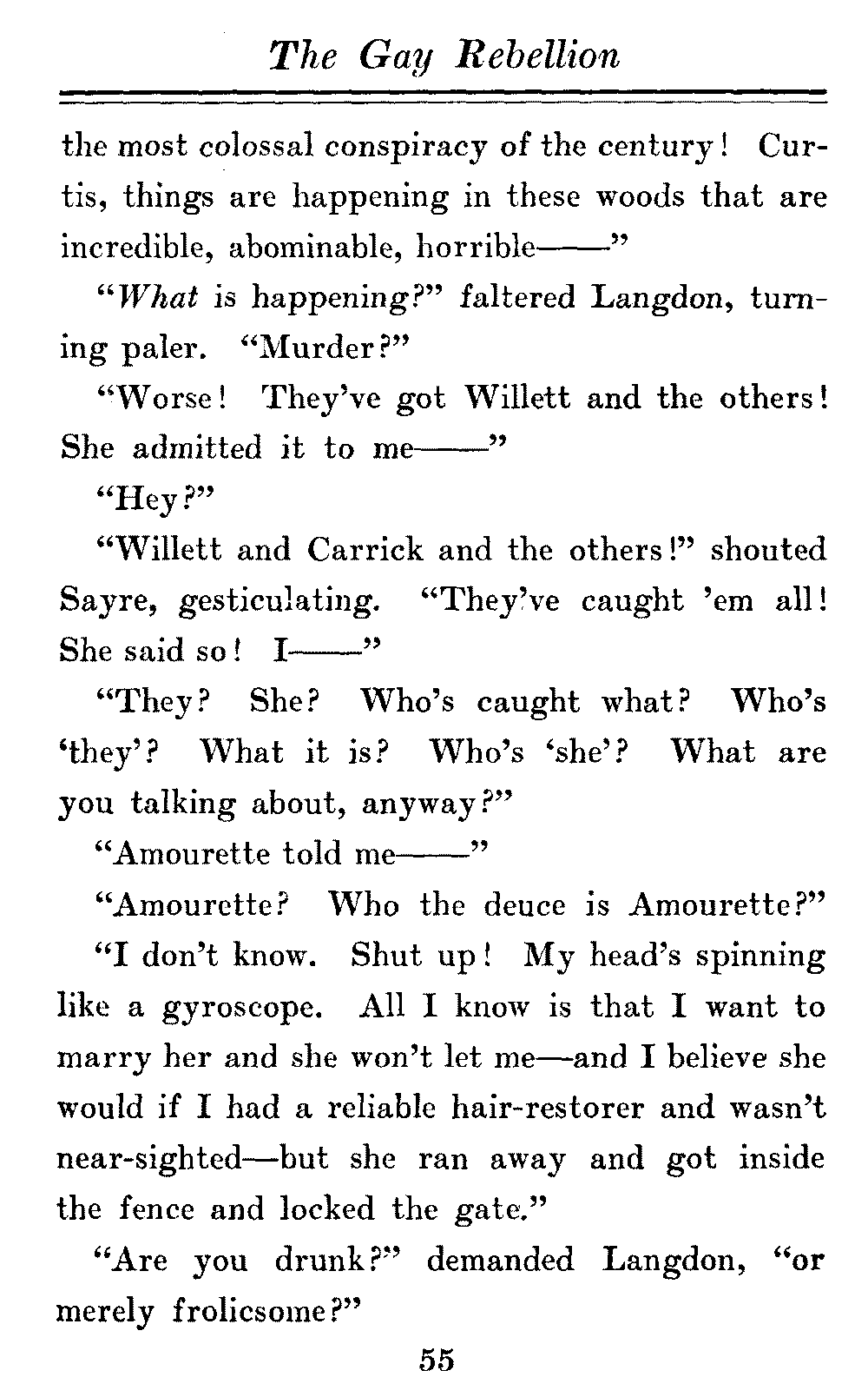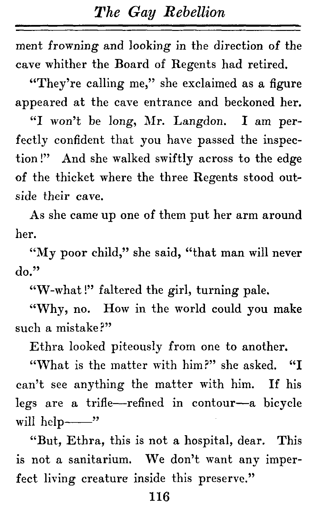 [2] Clergymen were in a pitiable condition for lack of fees and teas; the marriage license bureau was open only Mondays and Saturdays; the social columns of the newspapers were abolished. All over the Union young men were finding time hanging heavy on their hands after business hours because there was little to do now that every town had its Franchise Clubs magnificently fitted with every requisite that a rapidly advancing sex could possibly demand.