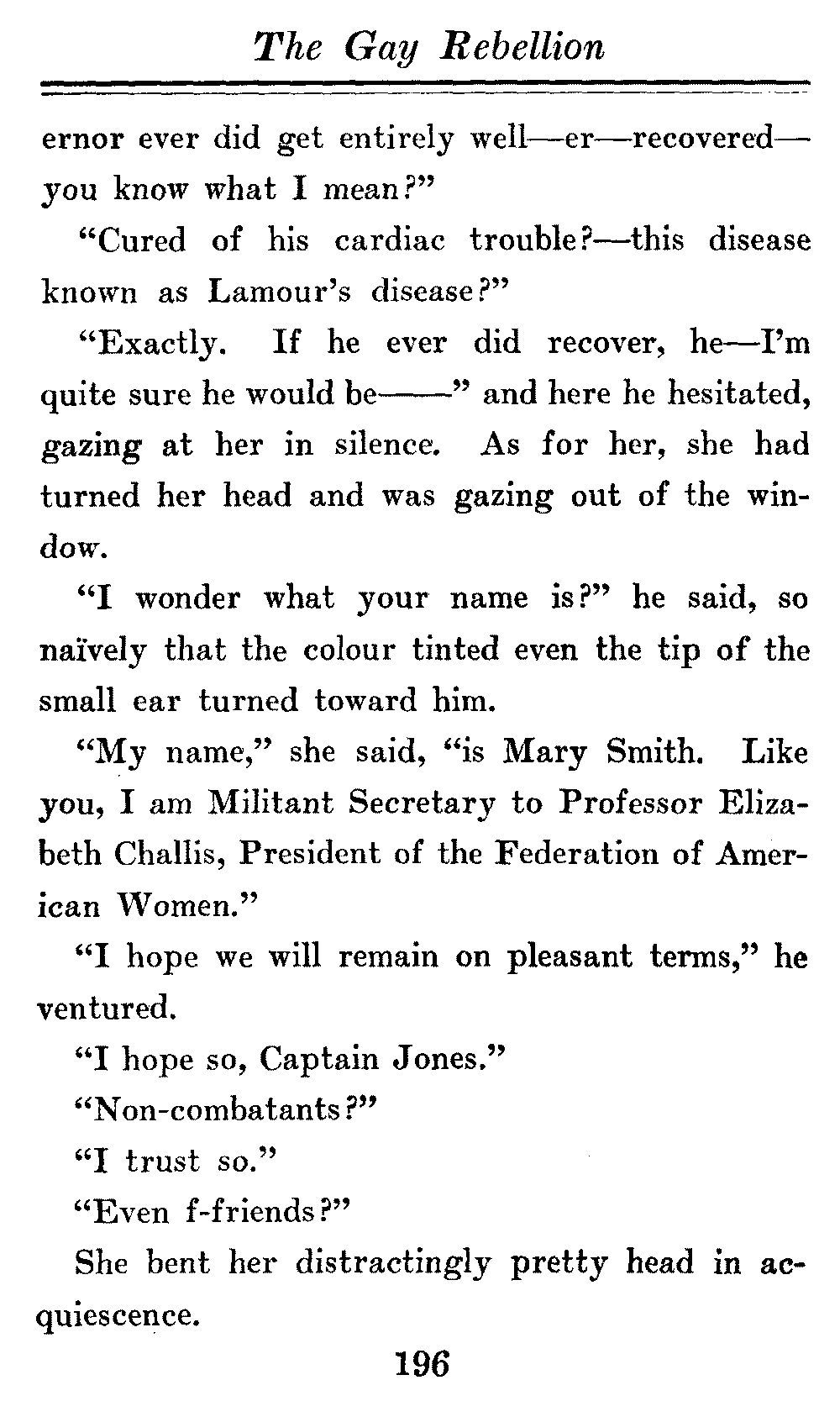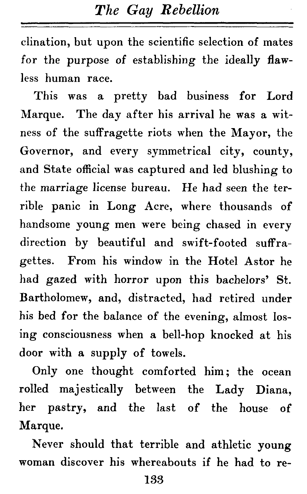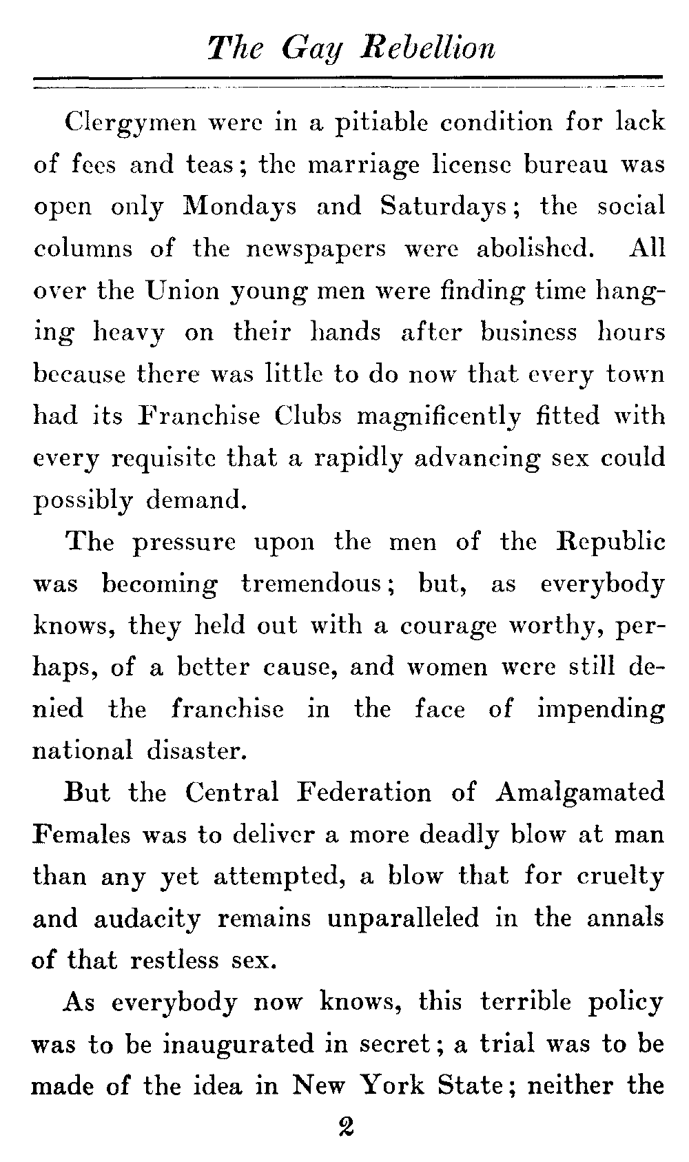 The year had been, as everybody knows, a momentous and sinister year for the masculine sex; marriages and births in the United States alone had fallen off nearly eighty per cent.; the establishment of Suffragette Unions in every city, town, and village of the country, their obedience to the dictation of the Central National Female Franchise Federation; the financial distress of the florists, caterers, milliners and modistes incident to the almost total suspension of social functions throughout the great cities of the land, threatened eventually to paralyse the nation's business.