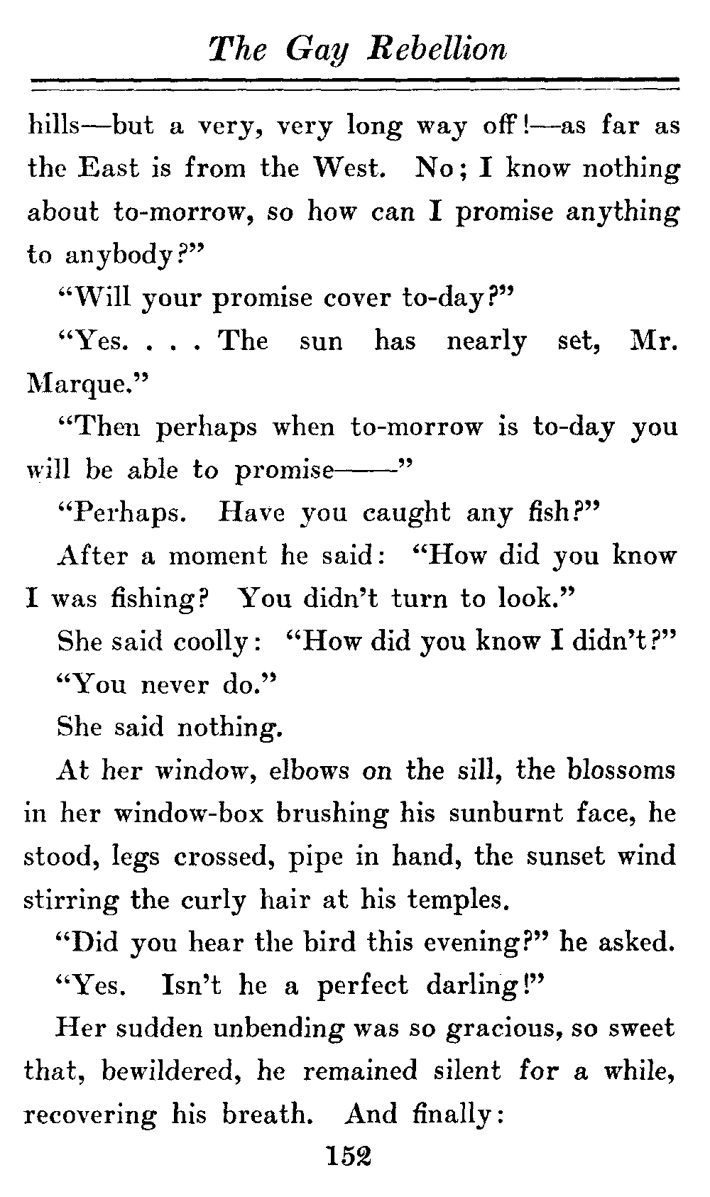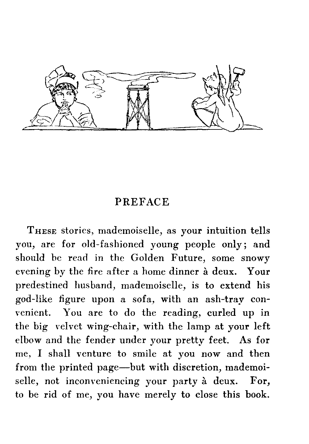 These stories, mademoiselle, as your intuition tells you, are for old-fashioned young people only; and should be read in the Golden Future, some snowy evening by the fire after a home dinner à deux. Your predestined husband, mademoiselle, is to extend his god-like figure upon a sofa, with an ash-tray convenient. You are to do the reading, curled up in the big velvet wing-chair, with the lamp at your left elbow and the fender under your pretty feet. As for me, I shall venture to smile at you now and then from the printed page—but with discretion, mademoiselle, not inconveniencing your party à deux. For, to be rid of me, you have merely to close this book.