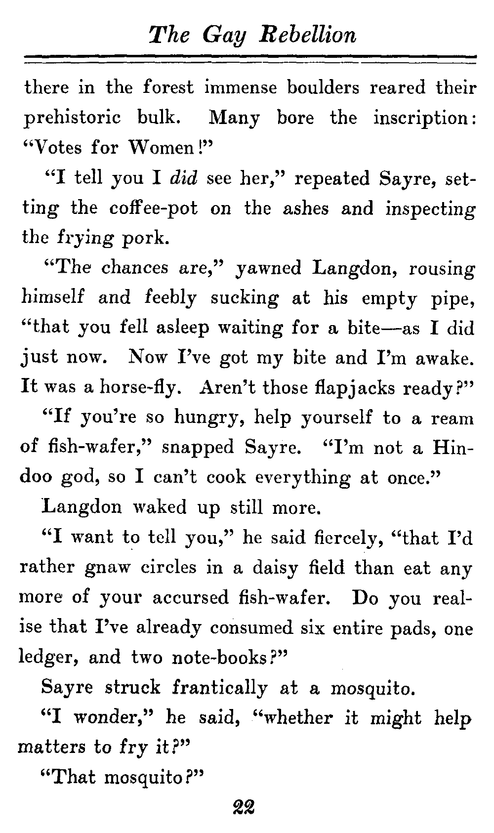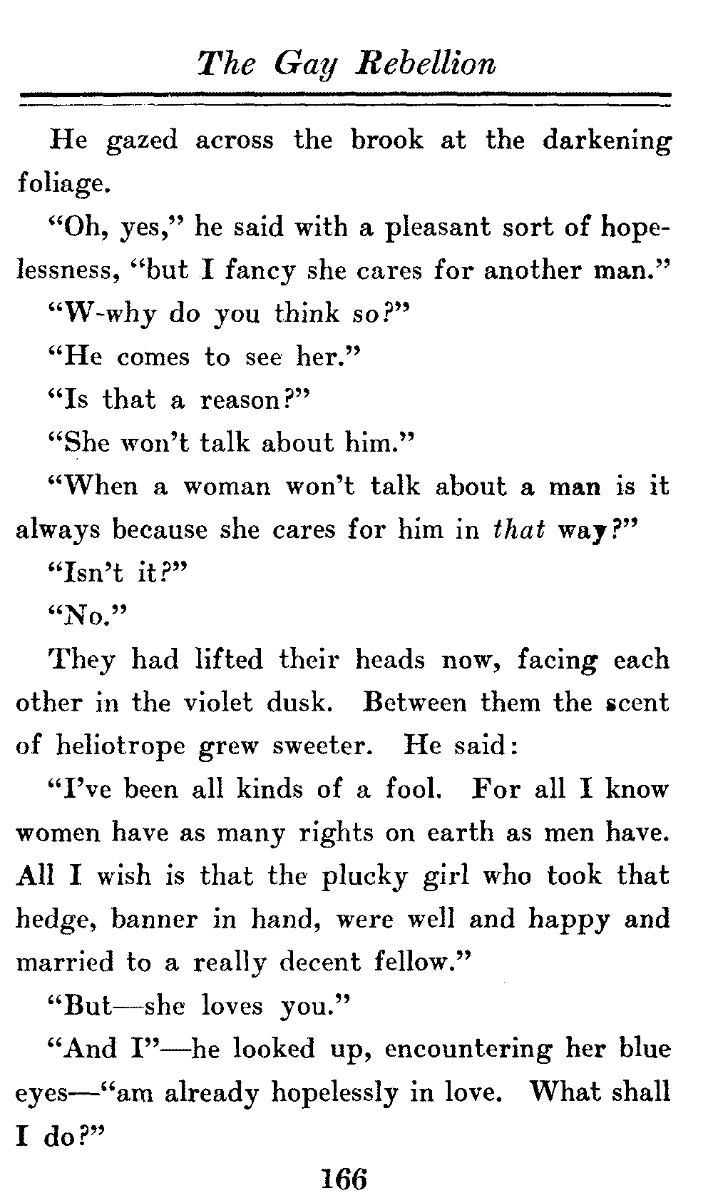 "He sure did. That poem seemed to deal a direct blow at this suffragette strike. Several women subscribers sent in mash notes. I had a mind to take advantage of one or two myself."
