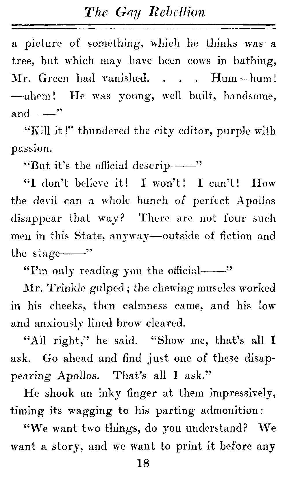 So it happened one raw, windy day in May, Mr. Melnor entered his private office in the huge Morning Star building, in an unusually cheerful frame of mind and sent for the city editor, Mr. Trinkle.