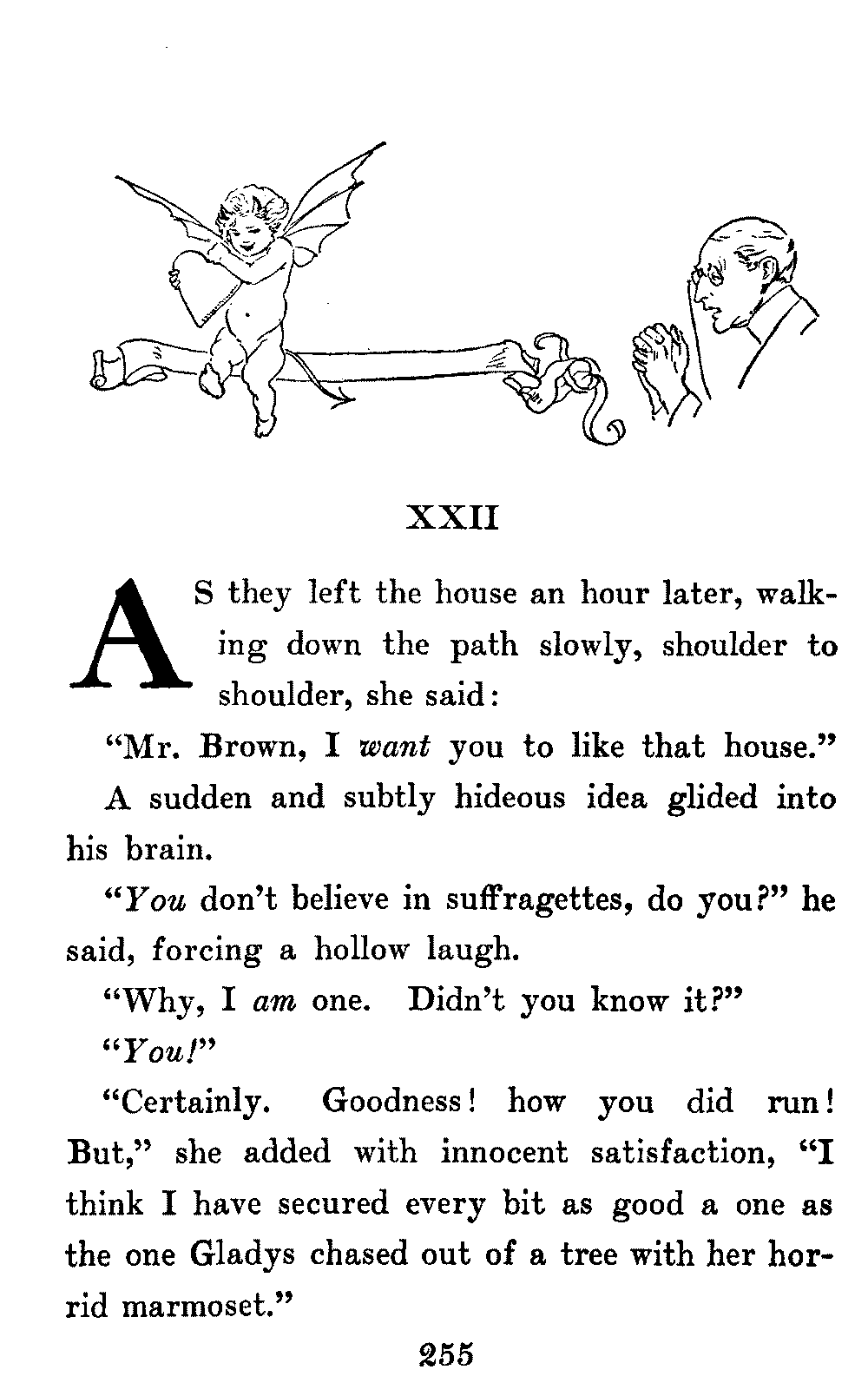 "An exceedingly pretty girl smiled at me on my way down town, Trinkle," he said exultantly. "That begins to look as though the backbone of this suffragette strike was broken. What?"