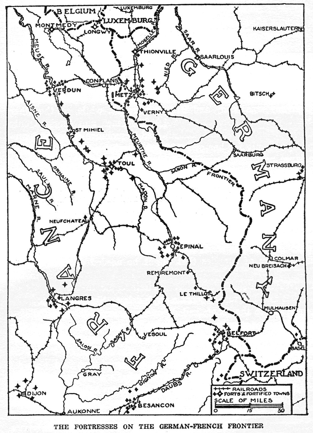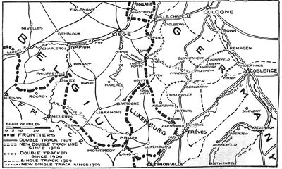 Thus the German plan of campaign was fully developed the second day of the war. It was no longer a secret to the general public, let alone to the French staff, which recognized that it had to deal with this effort of the German wing to come through Belgium. A French movement into Alsace failed. The public reason given for this was that it was a political demonstration in raising the Tricolor over the "lost provinces" dear to the heart of every Frenchman. Another—a military reason—which would seem a more obvious one to the soldier, was a counteroffensive to draw off the force of the German offensive at Liege and Namur, hoping thus, at least, while Liege and Namur were holding the German right in position, to force the German left to the bank of the Rhine. If you will look at the map you will see that this strategy becomes transparently intelligible.