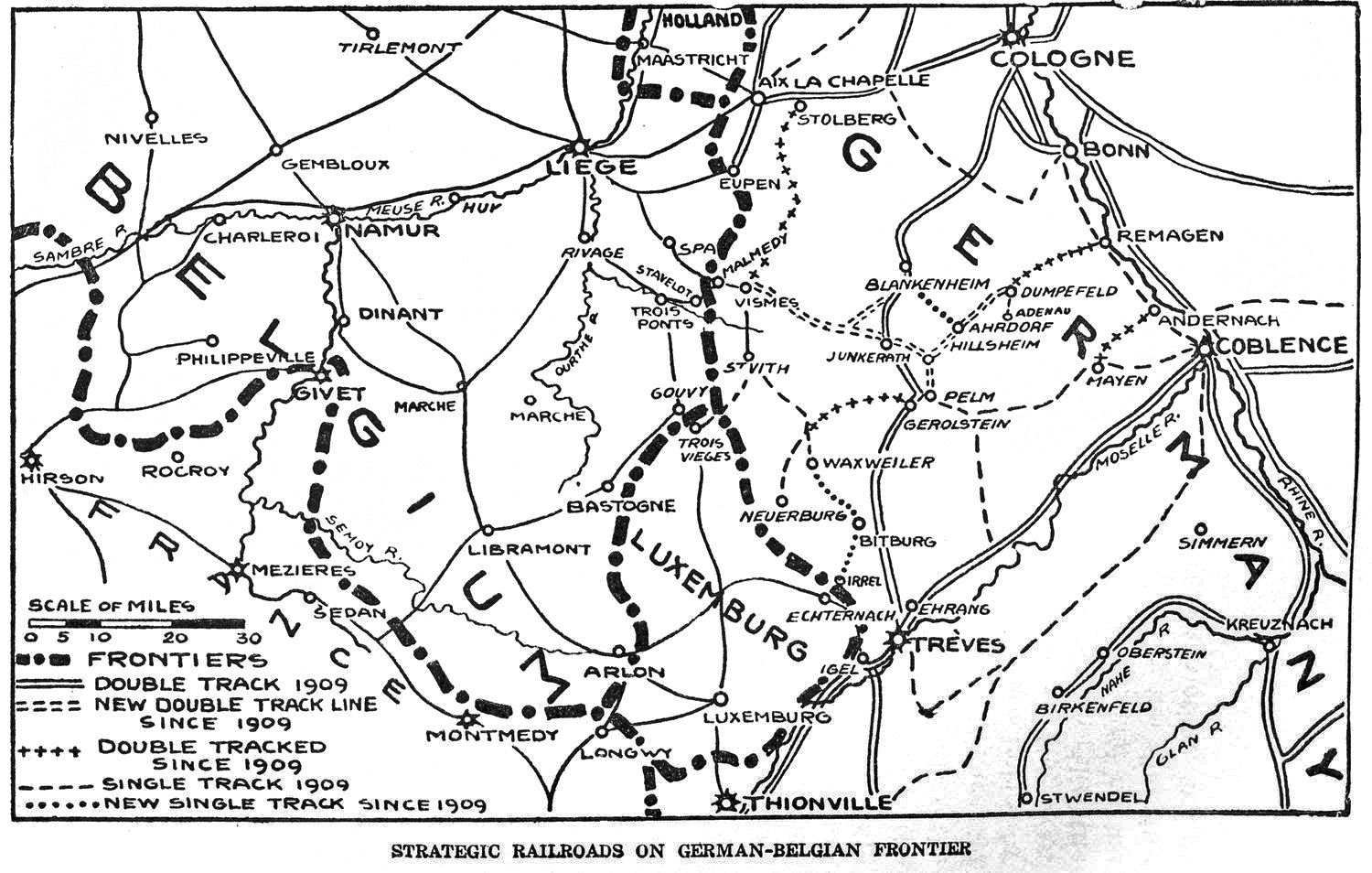 Strategically, the situation of the Central Powers was extremely strong. Aside from the fact that their preparedness in numbers of trained men, in arms and material, is too well known for mention here, their excellent network of railways (p. 033) enabled them to make rapid concentration. They had what is known as the interior line, which gave Meade his advantage at Gettysburg. Whether the interior line is three miles or a thousand miles long does not affect the principle involved. Interior lines mean quick transportation of reserves from point to point in concentration. It does not matter whether their numbers are hundreds or hundreds of thousands; the advantage is intrinsically the same. Joffre had probably fifteen hundred thousand on the interior line of the Marne. Meade had seventy thousand at Gettysburg.
