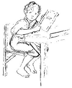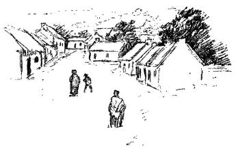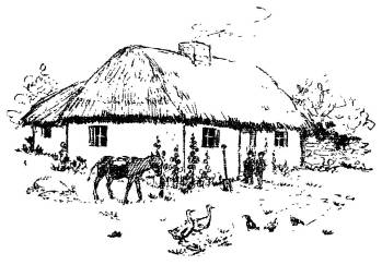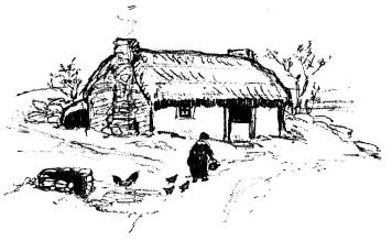 She pulled a little wooden table out before the fire, put three plates and three cups on it, some salt, and the jug of milk. Meanwhile Larry was out trying to shut the hens into the little shelter beside the house. But he couldn’t get them all in. One old speckled hen ran round the house to the door. Larry ran after her. The hen flew up on top of the half-door. She was very much excited. “Cut-cut-cut,” she squawked.