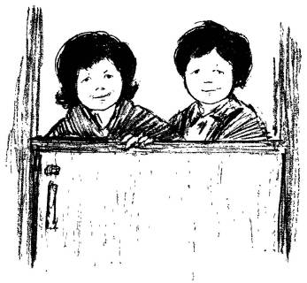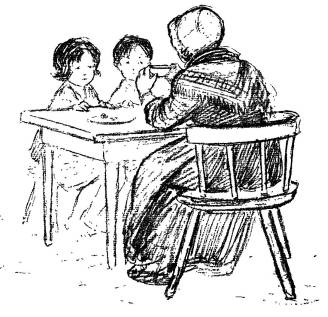Just as the kettle began to sing, there was a squawking among the hens on the doorstep, and two dark heads appeared above the closed half of the door.