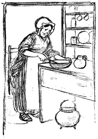 She went to the fireplace and hung the kettle on the hook, blew the coals to a blaze with a pair of leaky bellows, and sat down before the fire once more to wait for the water to boil.