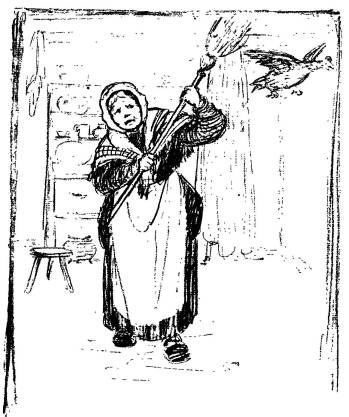 “Did you ever see the likes of that old Speckle, now?” cried Grannie Malone. She ran for the broom. “Sure she must be after thinking I was lonesome for a bit of company! Do you think I’d be wanting you at all, you silly, when I have the Twins by me?” she said to the hen. She shook the broom at her, but old Speckle
