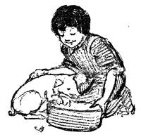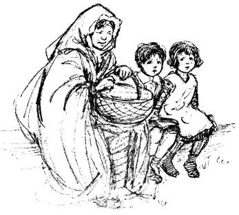She got down on her knees and buried the potatoes in the burning peat. Then she took a little broom that stood near by, and tidied up the hearth.