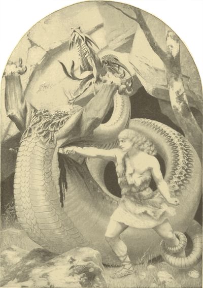 One morning Jupiter boasted among the gods in Olympus that a son would that day be born, in the line of Perseus, who would rule over all the Argives. Juno was angry and jealous at this, and, as she was the goddess who presided over the births of children, she contrived to hinder the birth of the child he intended till that day was over, and to hasten that of another grandson of the great Perseus. This child was named Eurystheus, and, as he had been born on the right day, Jupiter was forced to let him be King of Argos, Sparta, and Mycenæ, and all the Dorian race; while the boy whom he had meant to be the chief was kept in subjection, in spite of having wonderful gifts of courage and strength, and a kind, generous nature, that always was ready to help the weak and sorrowful.