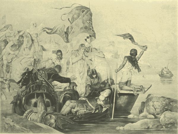 Theseus now ascended the throne of Athens. But his adventures were by no means concluded. He marched into the country of the Amazons, who dwelt on the Thermodon, according to some accounts, in the company of Hercules, and carried away their queen, Antiope. The Amazons in revenge invaded Attica, and were with difficulty defeated by the Athenians. This battle was one of the favorite subjects of the ancient artists, and is commemorated in several works of art that are still extant. Theseus also took part in the Argonautic expedition and the Calydonian hunt. He assisted his friend Pirithous and the Lapithæ in their contest with the Centaurs, and also accompanied the former in his descent to the lower world to carry off Proserpine, the wife of Pluto. When Theseus was fifty years old, according to tradition, he carried off Helen, the daughter of Leda, who was then only nine years of age. But his territory was invaded in consequence by Castor and Pollux, the brothers of Leda; his own people rose against him, and at last, finding his affairs desperate, he withdrew to the island of Scyros, and there perished, either by a fall from the cliffs or through the treachery of Lycomedes, the king of the island. For a long time his memory was forgotten by the Athenians, but he was subsequently honored by them as the greatest of their heroes. At the battle of Marathon they thought they saw him armed and bearing down upon the barbarians, and after the conclusion of the Persian war his bones were discovered at Scyros by Cimon, who conveyed them to Athens where they were received with great pomp and deposited in a temple built to his honor. A festival also was instituted, which was celebrated on the eighth day of every month, but more especially on the eighth of Pyanipsion.