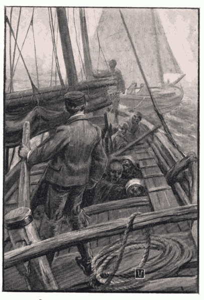 "Now get aboard, four of you," I said in a loud voice, indicating with my fingers that four of them were to go with me and the fifth was to remain by the junk. The Yellow Handkerchief hesitated; but I repeated the order fiercely (much more fiercely than I felt), at the same time sending my hand to my hip. Again the Yellow Handkerchief was overawed, and with surly [21]looks he led three of his men aboard the Reindeer. I cast off at once, and, leaving the jib down, steered a course for George's junk. Here it was easier, for there were two of us, and George had a pistol to fall back on if it came to the worst. And here, as with my junk, four Chinese were transferred to the sloop and one left behind to take care of things.