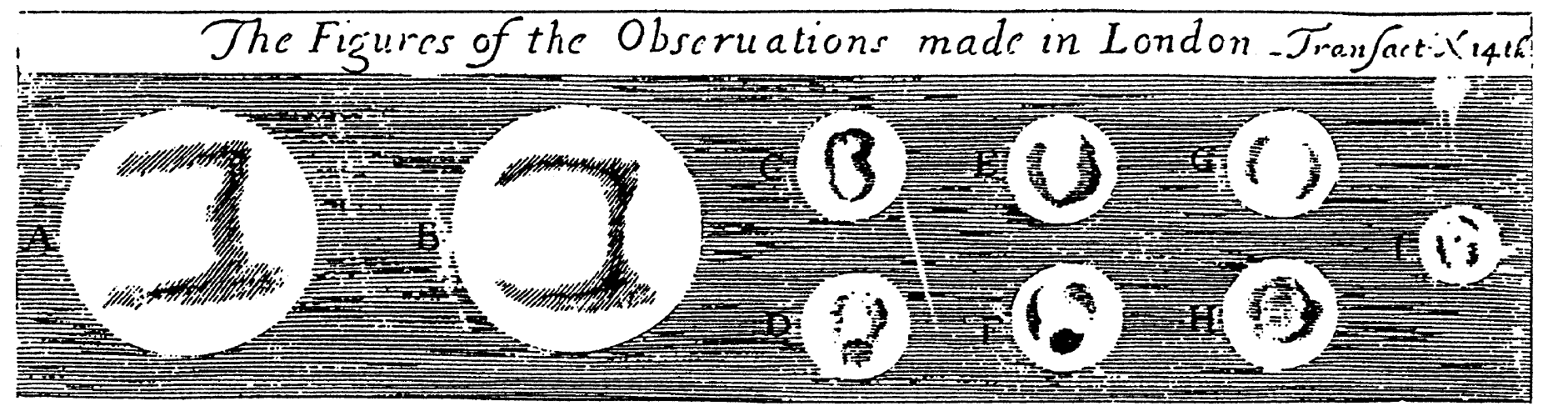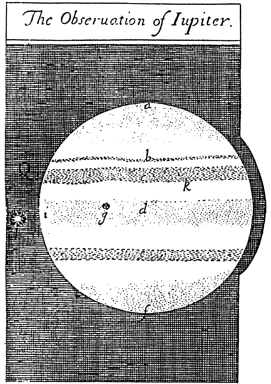 The Ingenious Mr. Hook did, some moneths since, intimate to a friend of his, that he had, with an excellent twelve foot Telescope, observed, some days before, he than spoke of it, (videl. on the ninth of May, 1664, about 9 of the clock at night) a small Spot in the biggest of the 3 obscurer Belts of Jupiter, and that, observing it from time to time, he found, that within 2 hours after, the said Spot had moved from East to West, about half the length of the Diameter of Jupiter.