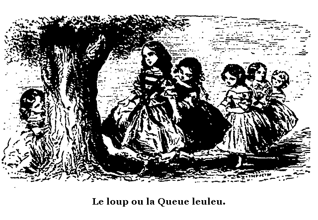 Ce jeu, assez ancien, ainsi que nous le verrons plus tard, s'appelle Queue leuleu, parce que les enfants marchent à la suite les uns des autres, comme marchent les loups, qu'en vieux français on nommait leux. Cette terreur du loup date du temps où les forêts étaient plus nombreuses et peuplées d'un grand nombre de ces féroces animaux. Aujourd'hui, à l'exception de quelques départements très-boisés ou montagneux qui servent encore de retraite aux loups, les enfants sont rarement exposés à en rencontrer ailleurs qu'au Jardin des plantes; cependant leur imagination, qui se figure si facilement les objets, agit quelquefois d'une manière très-vive dans ce jeu, et va jusqu'à la terreur au moment où le loup s'élance avec des hurlements à la poursuite des brebis fugitives.
