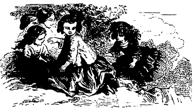 Pour nous justifier d'avoir présenté ici un jeu qui peut choquer les personnes délicates, nous rappellerons le souvenir d'une scène que nos jeunes lectrices liront peut-être un jour dans le charmant 18 roman de Goldsmith, le Vicaire de Wakefield; ce passage met complètement le jeu en action. Plusieurs jeunes filles sont réunies le soir d'un jour de fête chez un fermier du voisinage. Après avoir joué à plusieurs jeux, elles proposent celui de la savate. En conséquence, elles forment un rond en s'asseyant par terre, et en rassemblant la jupe de leurs robes un peu serrée contre elles. Puis on prend une pantoufle que l'on fait circuler sous l'arc que forment les genoux. Une certaine jeune miss, Olivia Primrose, est debout au milieu du cercle, essoufflée, rouge, agitée et criant, dit l'auteur, comme un chanteur de ballades. Au moment où le jeu est le plus animé, entrent, ô confusion! deux belles dames de Londres, dont on redoute beaucoup l'opinion, et les joueuses s'arrêtent interdites et consternées d'avoir été surprises dans ce vulgaire exercice.