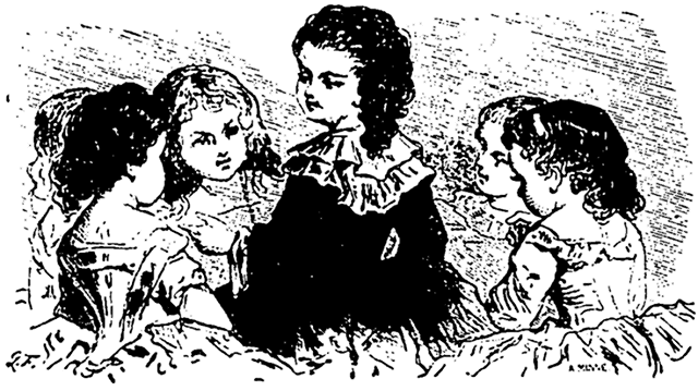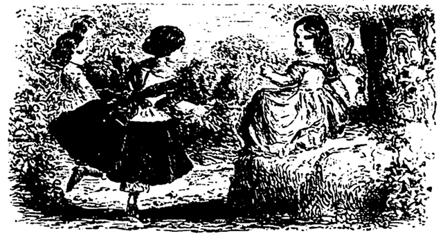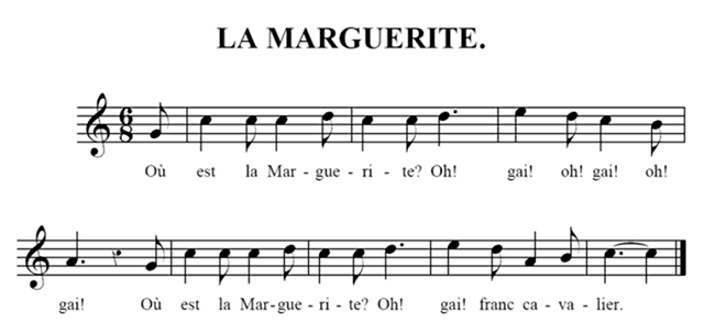 Note 3: (retour) Nous n'avons pas placé ce jeu parmi les rondes, parce qu'il n'est accompagné que d'une très-courte phrase de chant qui se rattache à l'action, mais sans la diriger, tandis que les rondes dont se compose la troisième partie de notre livre sont pour la plupart de petites scènes qui se jouent et se dansent à l'aide d'un chant presque continuel, qui en détermine les différentes parties.