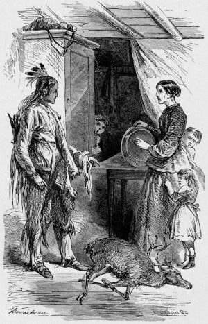 “Steady, steady,” said he, as they neared the animal. They had succeeded in approaching within a few yards, and Tom, with outspread arms and eagle eye, advanced slowly, watching to seize him if he should attempt to spring away, when little Bub, who had been sent into the cabin by Tom, having gone around unobserved on the outside of the garden behind the deer, suddenly ran a sharp stick through the brush into the creature’s back, saying,–
