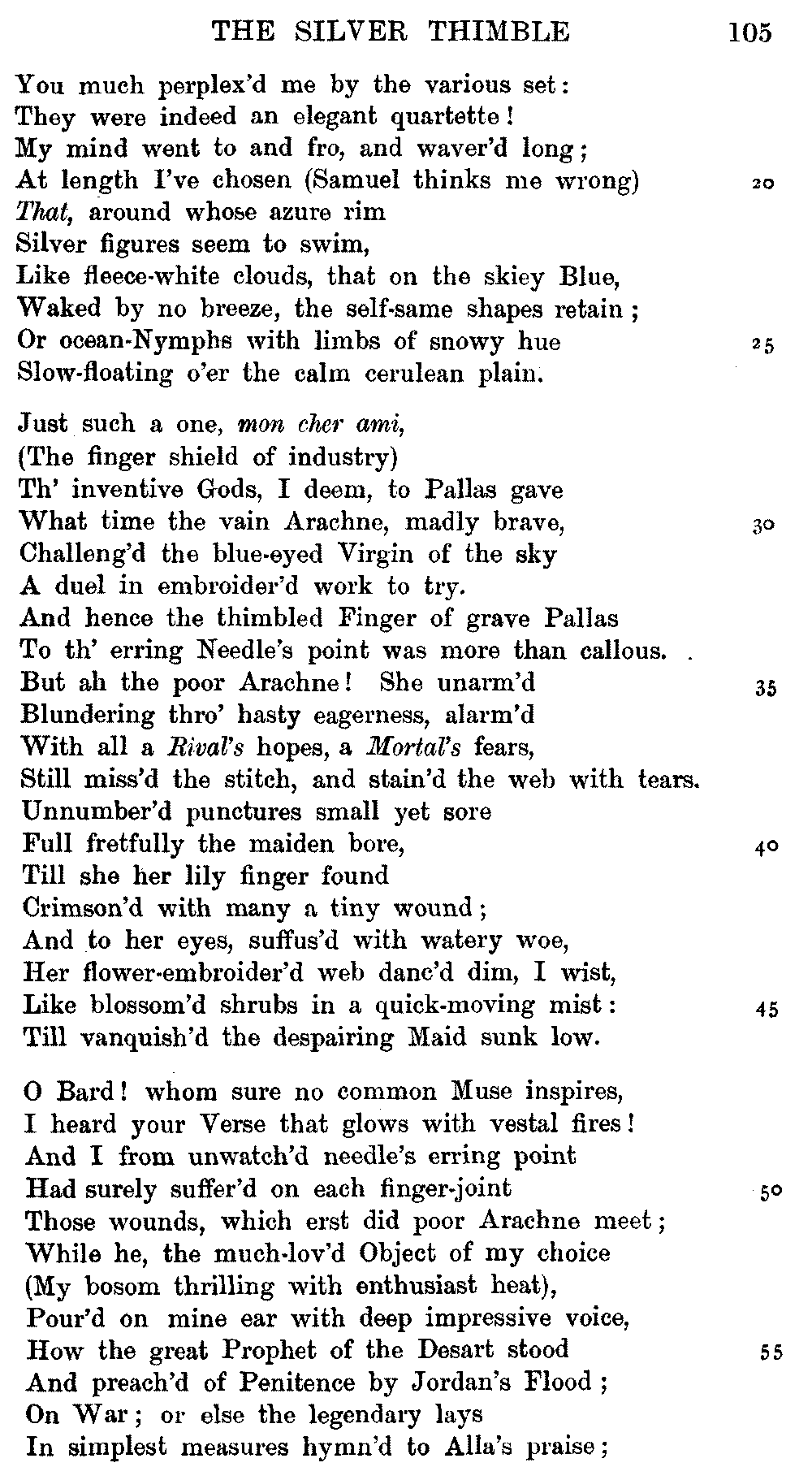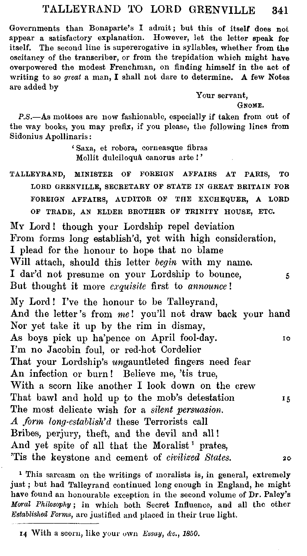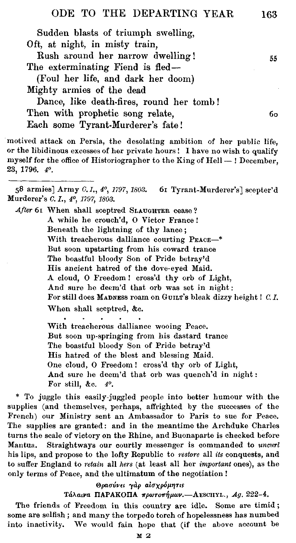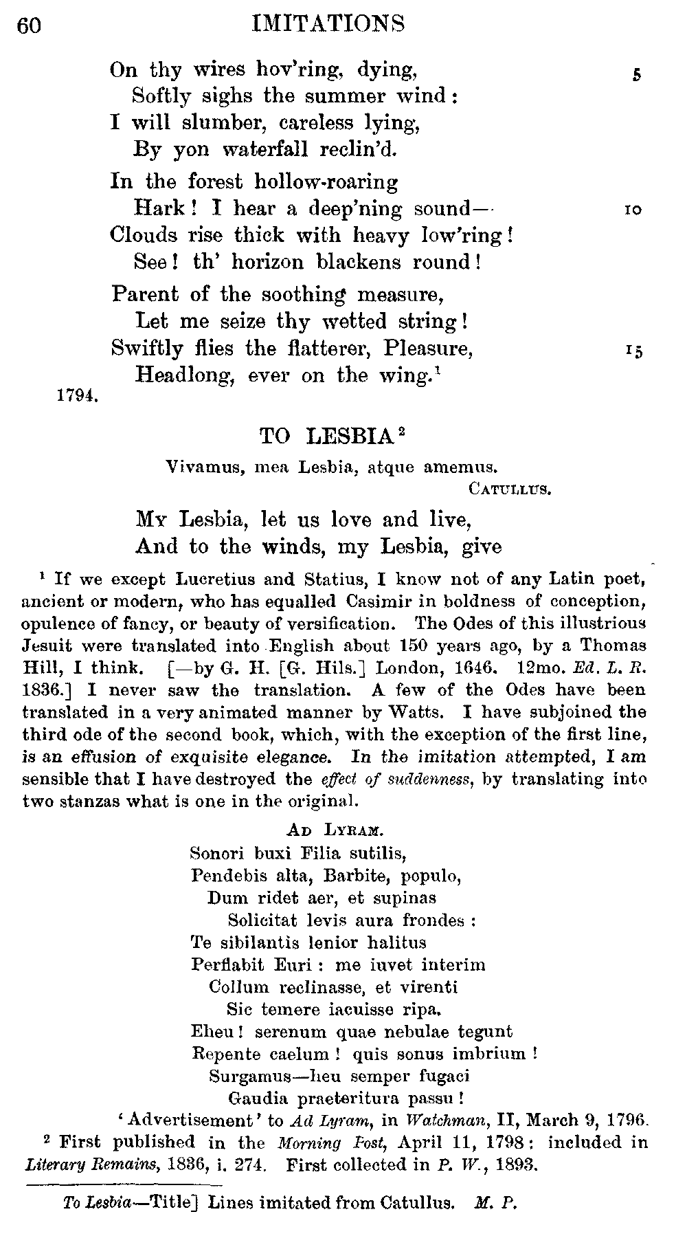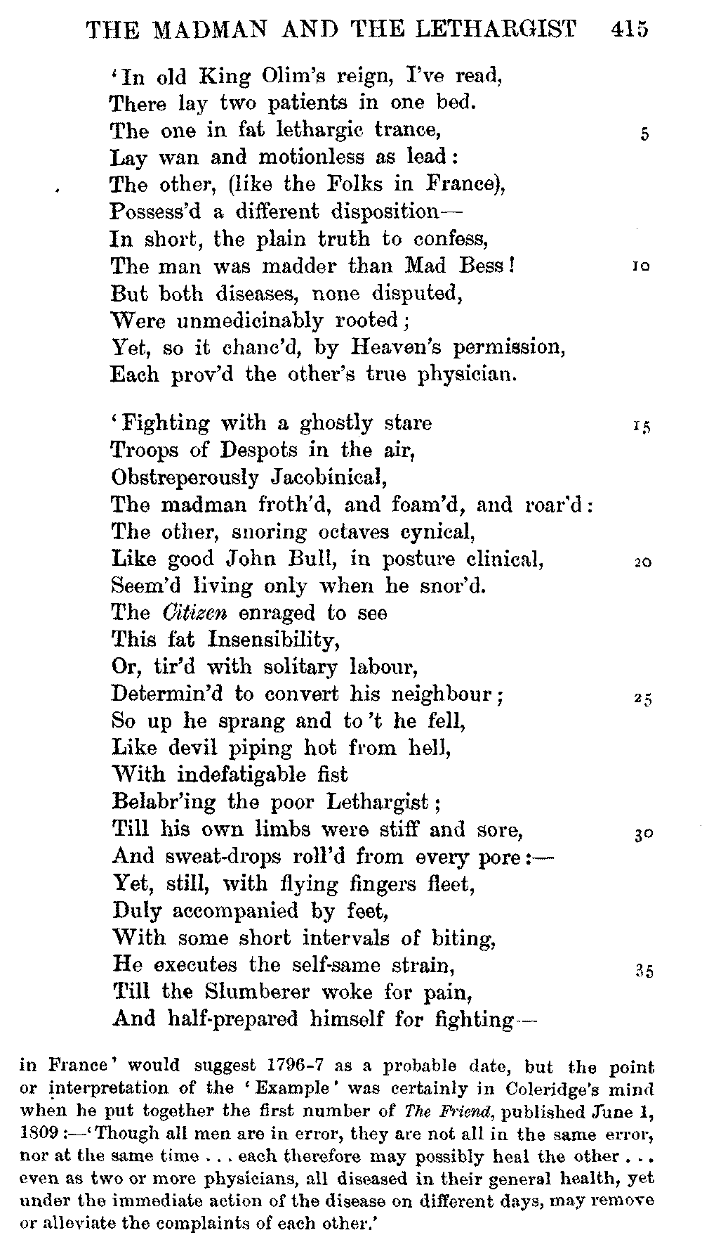 The fourth, 'The Madman and the Lethargist' (p. 414), is an expansion of an epigram in the Greek Anthology. It is possible that it was written in Germany in 1799, and is contemporary with the epigrams published in the Morning Post in 1802, for the Greek original is quoted by Lessing in a critical excursus on the nature of an epigram.